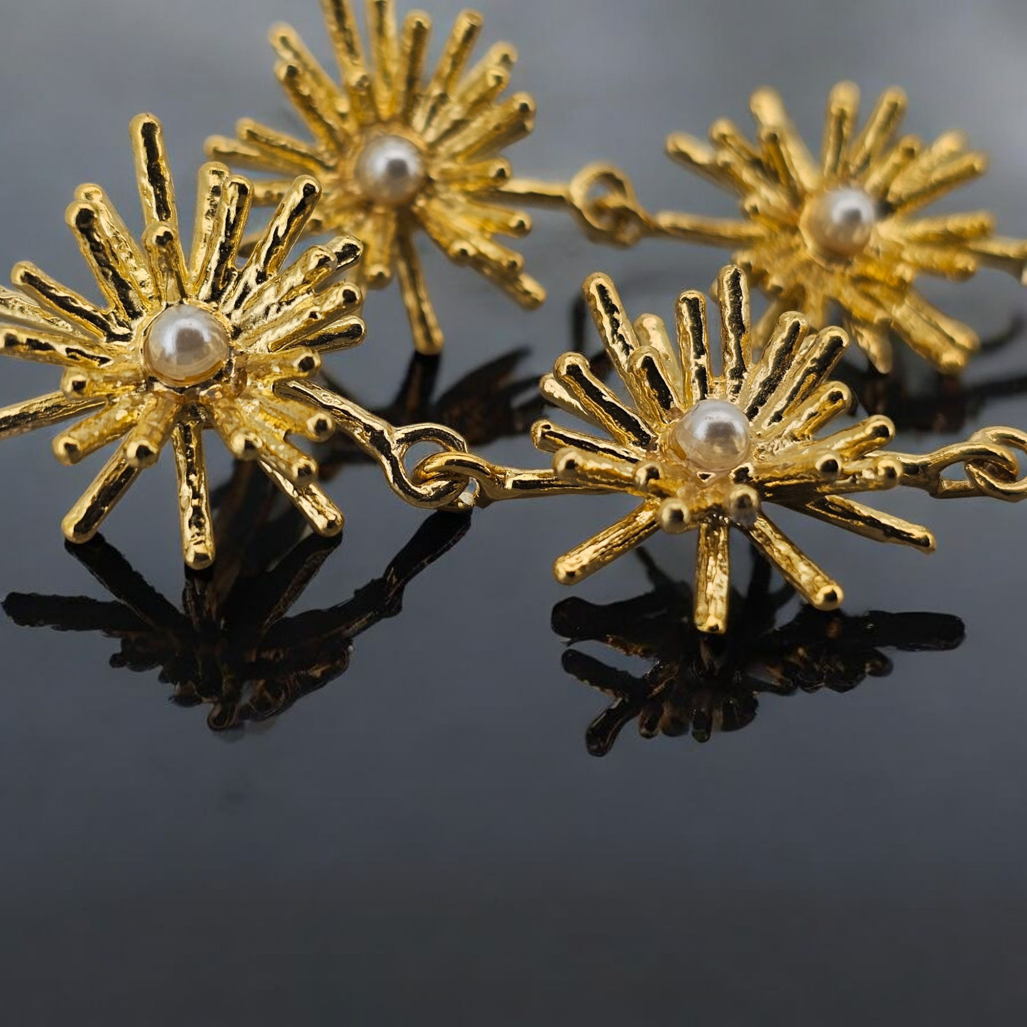 The Nova Stella earrings, part of the LONA EDEN collection, echo the celestial energy of the Mare Nova Ring. Each earring features a delicate constellation of three golden stars, cradling glowing pearls like drops of moonlight. Inspired by the moment where ocean tides meet starlight, this design carries both stillness and movement a quiet power that speaks to intuition, softness, and wonder. A cosmic companion for those who feel guided by both sea and sky.
