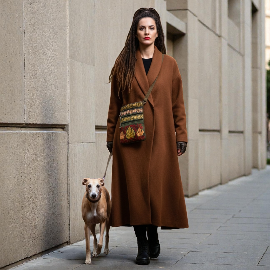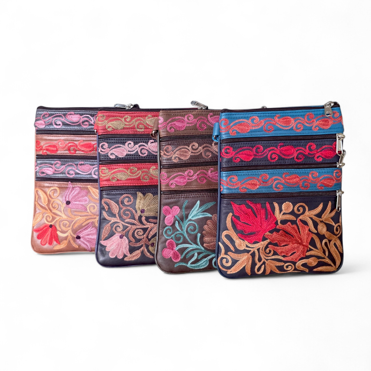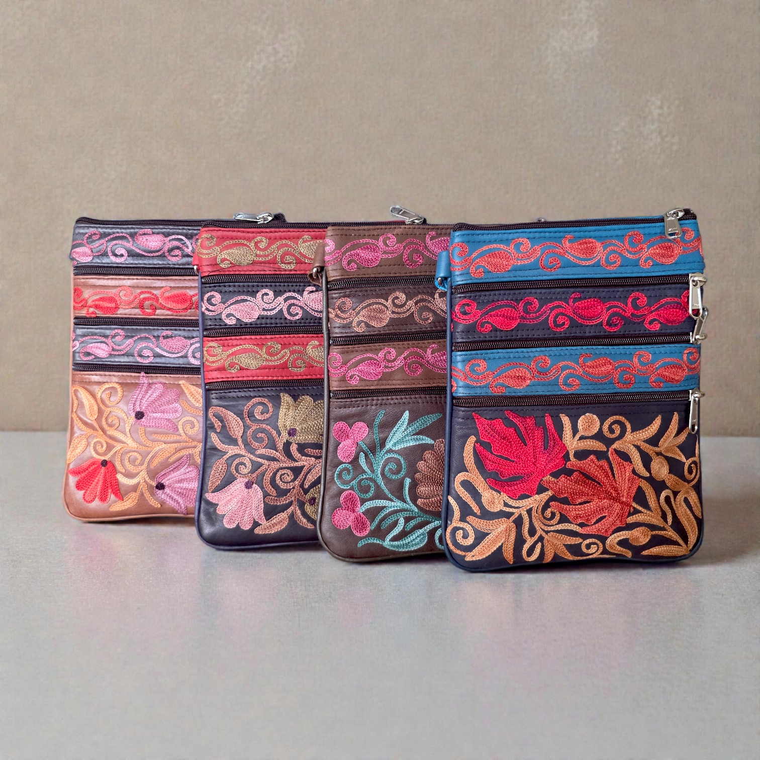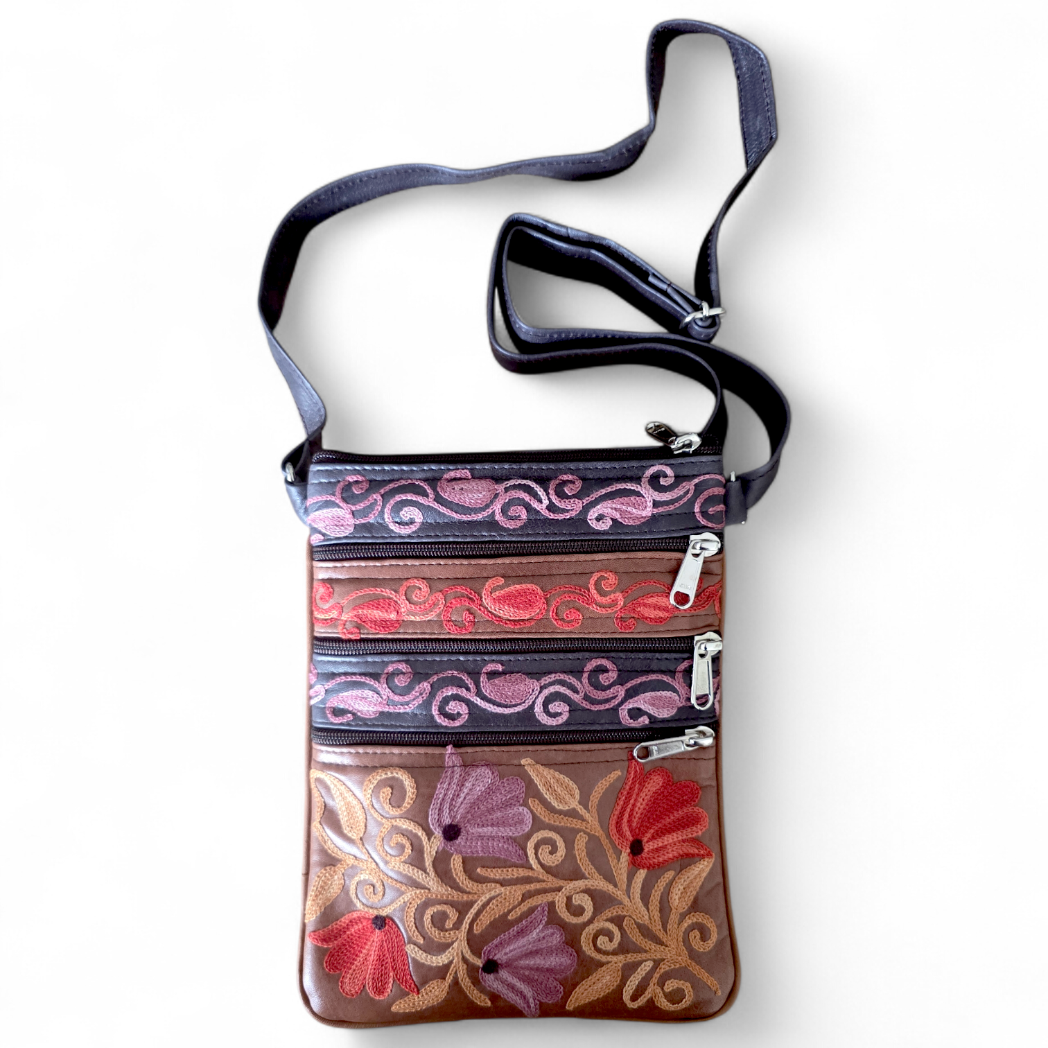 This handcrafted crossbody bag is made from soft sheep leather and finished with intricate embroidery inspired by traditional Kashmiri patterns.