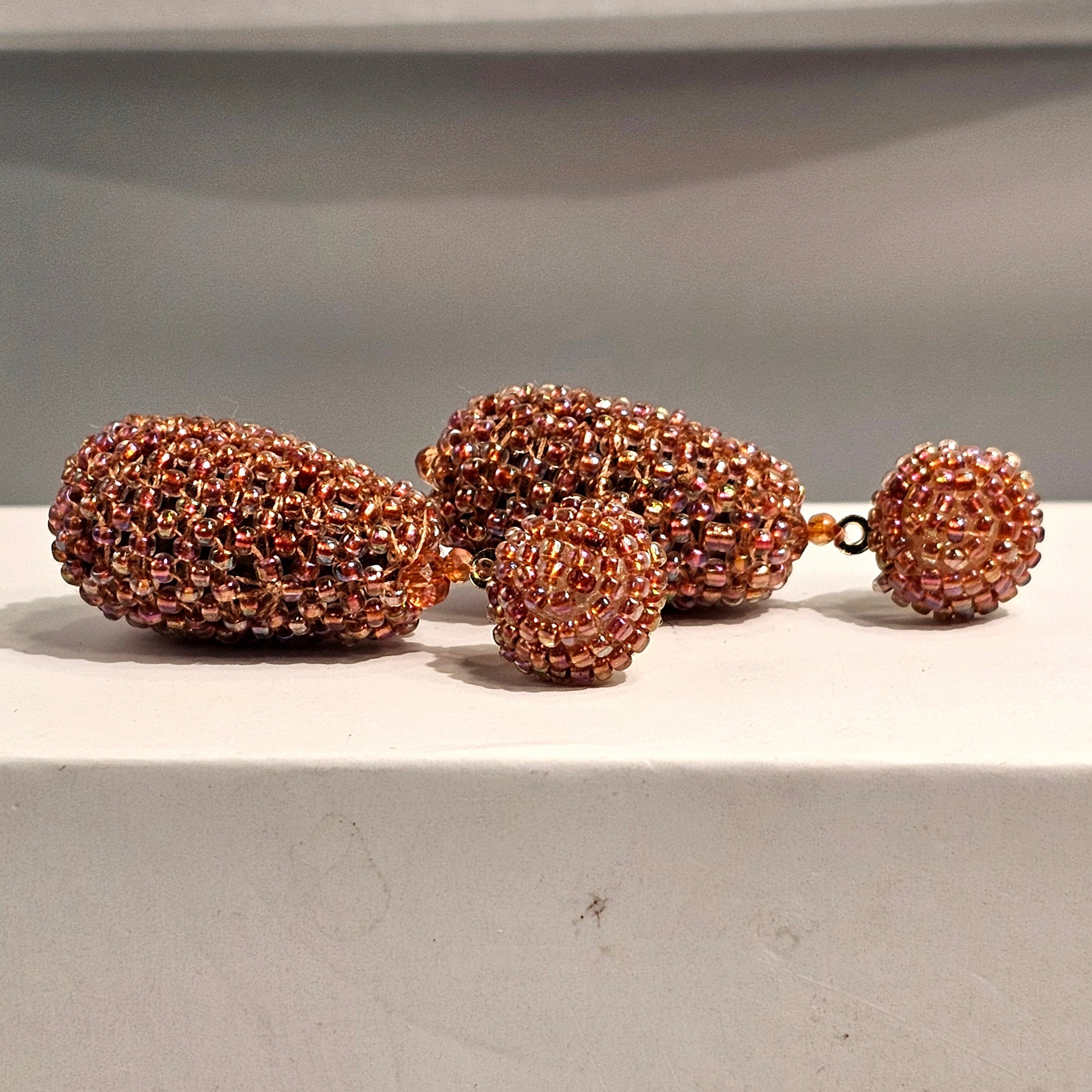 The Beaded Drop earrings celebrate the intricate craftsmanship of the LONA LOOM Beaded Collection. Each pair is crocheted by hand with delicate glass beads, woven tightly around a smooth wooden core. The result is a soft yet structured texture that catches the light beautifully. Available in a range of expressive tones  from deep black and bronze to vibrant red and green  every color tells its own story. Despite their sculptural appearance, they weigh just 6.2 grams, offering a statement look that feels featherlight.