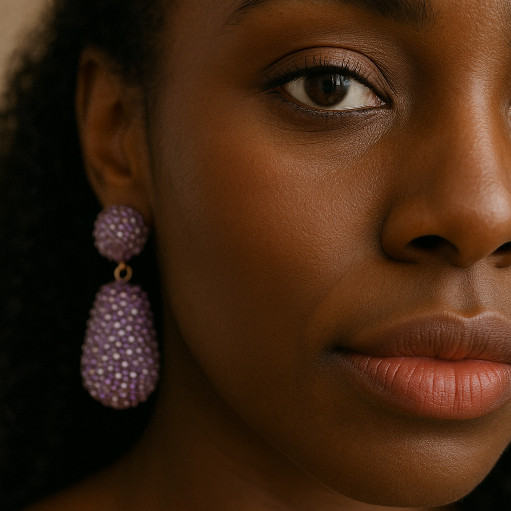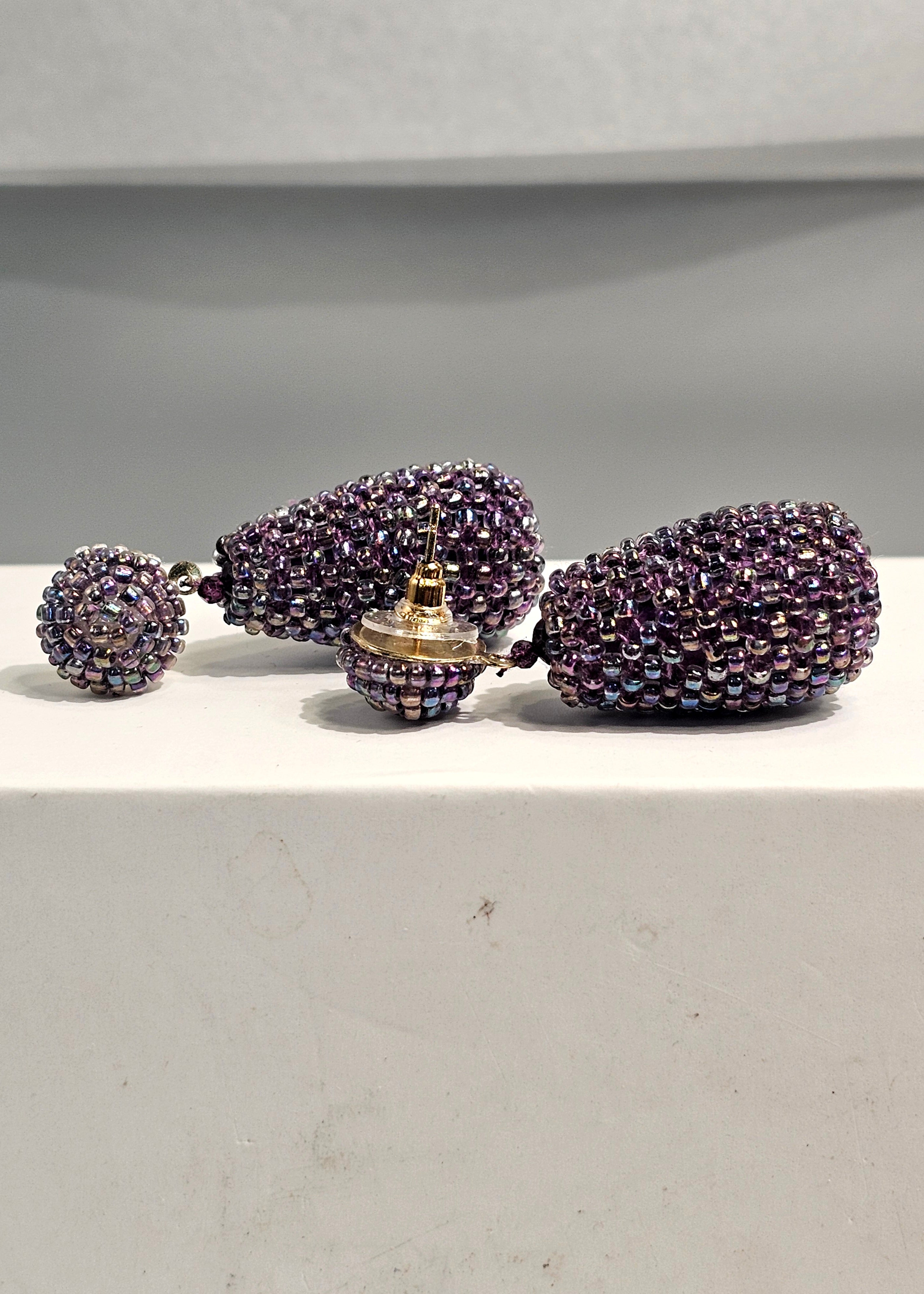 The Beaded Drop earrings celebrate the intricate craftsmanship of the LONA LOOM Beaded Collection. Each pair is crocheted by hand with delicate glass beads, woven tightly around a smooth wooden core. The result is a soft yet structured texture that catches the light beautifully. Available in a range of expressive tones  from deep black and bronze to vibrant red and green  every color tells its own story. Despite their sculptural appearance, they weigh just 6.2 grams, offering a statement look that feels featherlight.