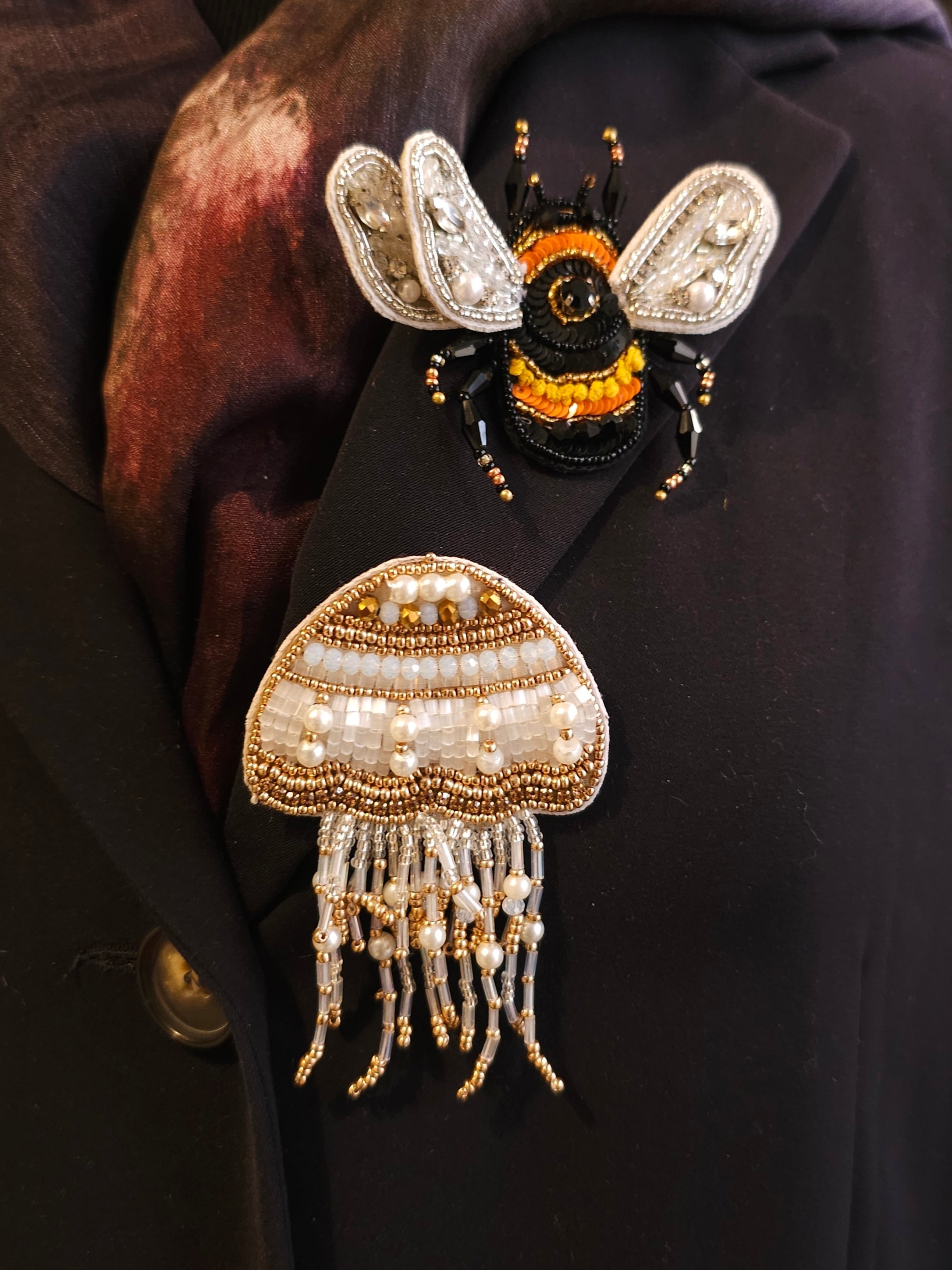 Material: Mixed technique: beads, sequins, textile, metal pin