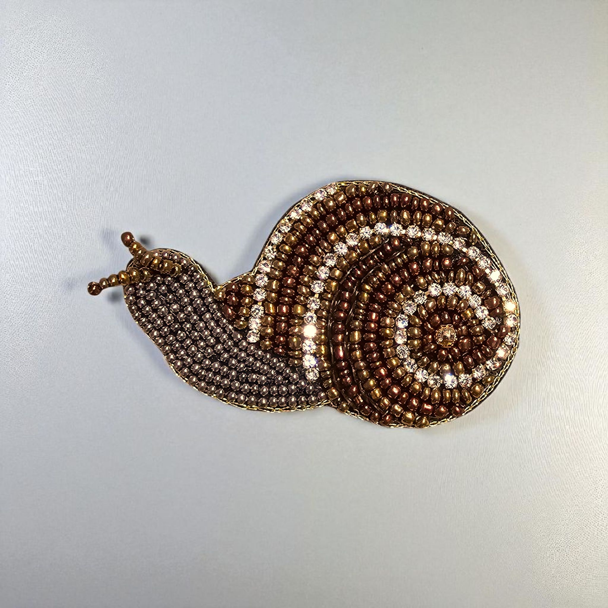 Helix Brooch transforms the snail into a delicate work of bead embroidery. Its 4 × 7 cm shape captures the spiraling shell and slow, graceful movement of the creature. Weighing 7.5 g, it’s light enough for everyday wear yet striking as an artful detail. In many cultures, the snail symbolizes patience and resilience — qualities reflected in the careful craftsmanship of this piece.