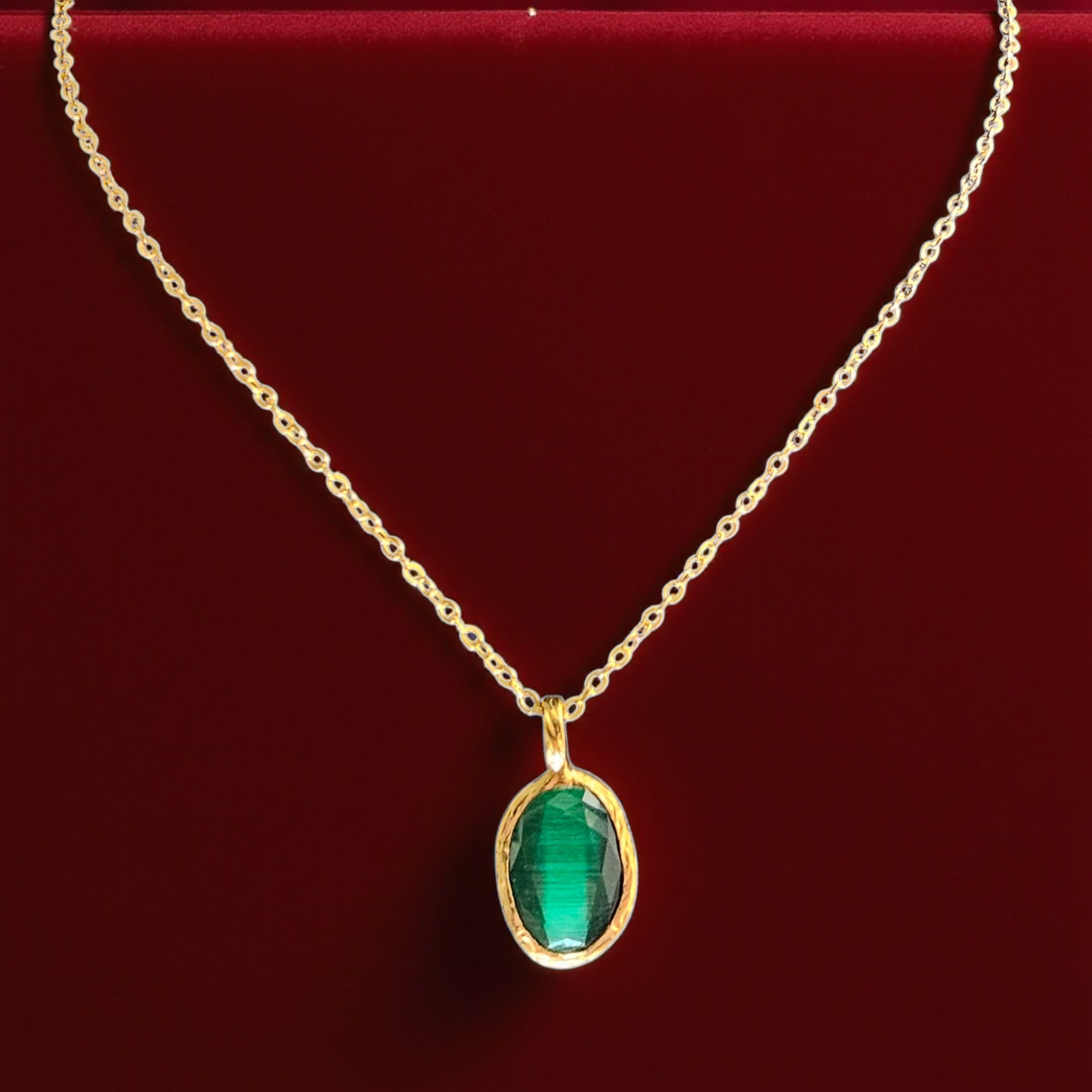 The Glow Necklace Grass Green is a lively piece that brings a fresh accent to any outfit. The vivid green cat eye stone shimmers beautifully with the light, while the 22k gold-plated brass setting adds a timeless touch. With its adjustable chain, this necklace can be worn solo as a striking statement or layered with other jewelry from the Glow collection for a bold yet elegant look.
