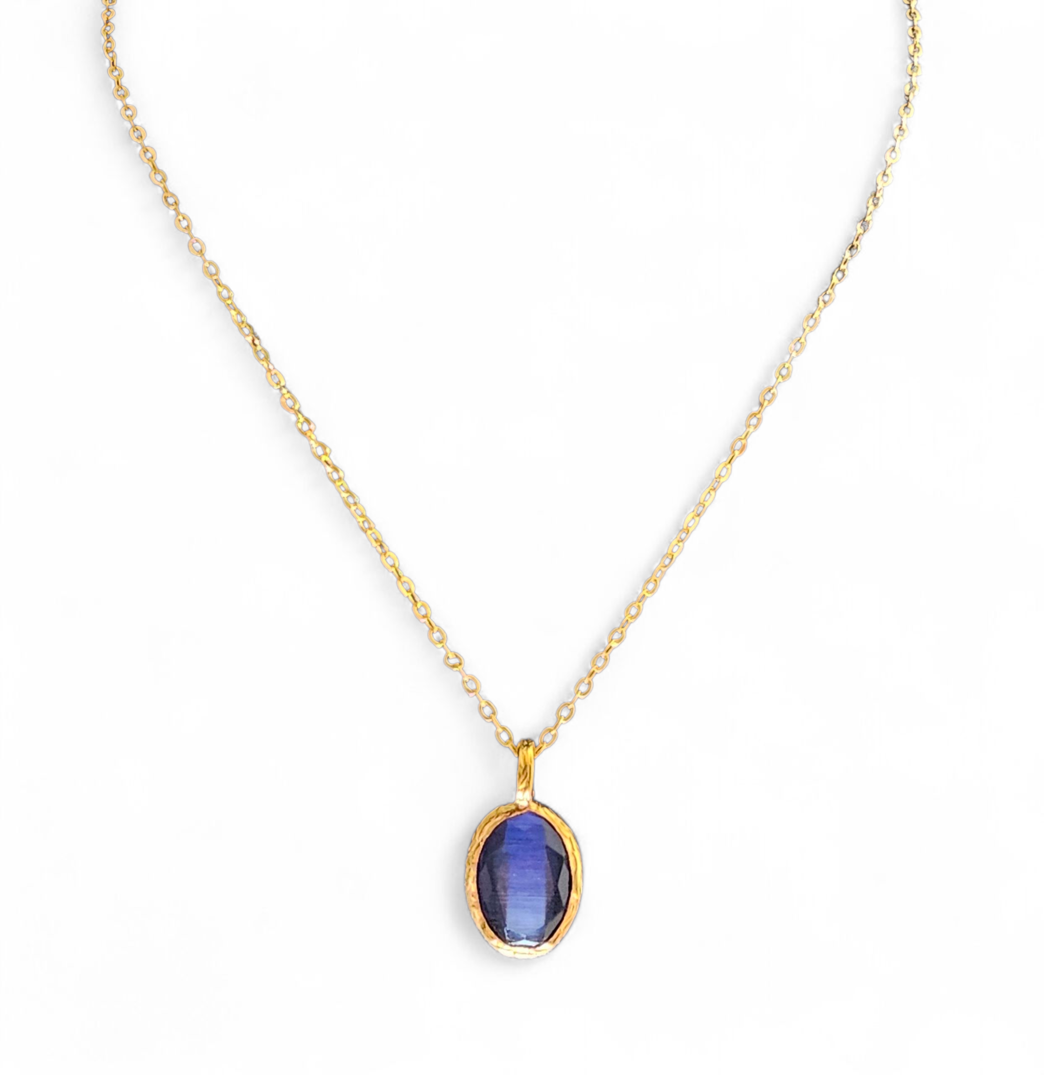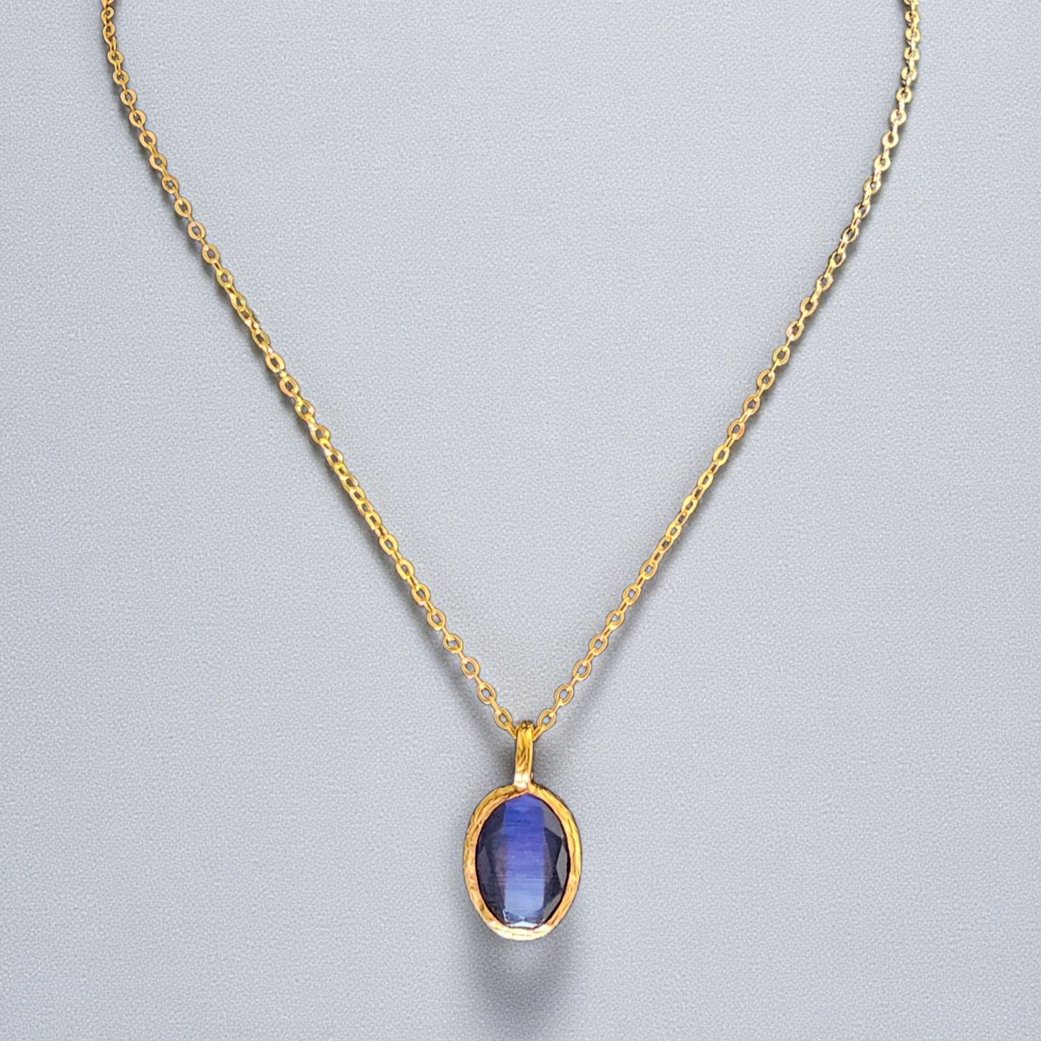 The Glow Necklace Purple Blue combines timeless design with the natural shimmer of cat eye stone. The purple-blue shade gives a subtle play of color that shifts with the light, while the 22k gold-plated brass setting adds an elegant touch. With its adjustable chain, this necklace is perfect to wear on its own for a refined look or layered with other Glow pieces for a modern style.