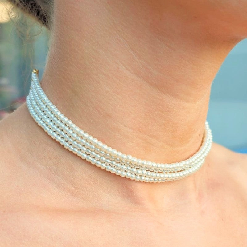 The Celeste Pearl Choker from the LONA DELICA collection is a statement piece that merges elegance with modern edge. Designed with four rows of glass pearls (3.5 mm), this necklace sits gracefully at 29 cm with a 19 cm extender for adjustable styling. The layered strands create a refined, structured silhouette that elevates both minimal looks and evening outfits. At 21.1 g, it feels substantial yet comfortable a timeless design that balances delicacy with bold presence.