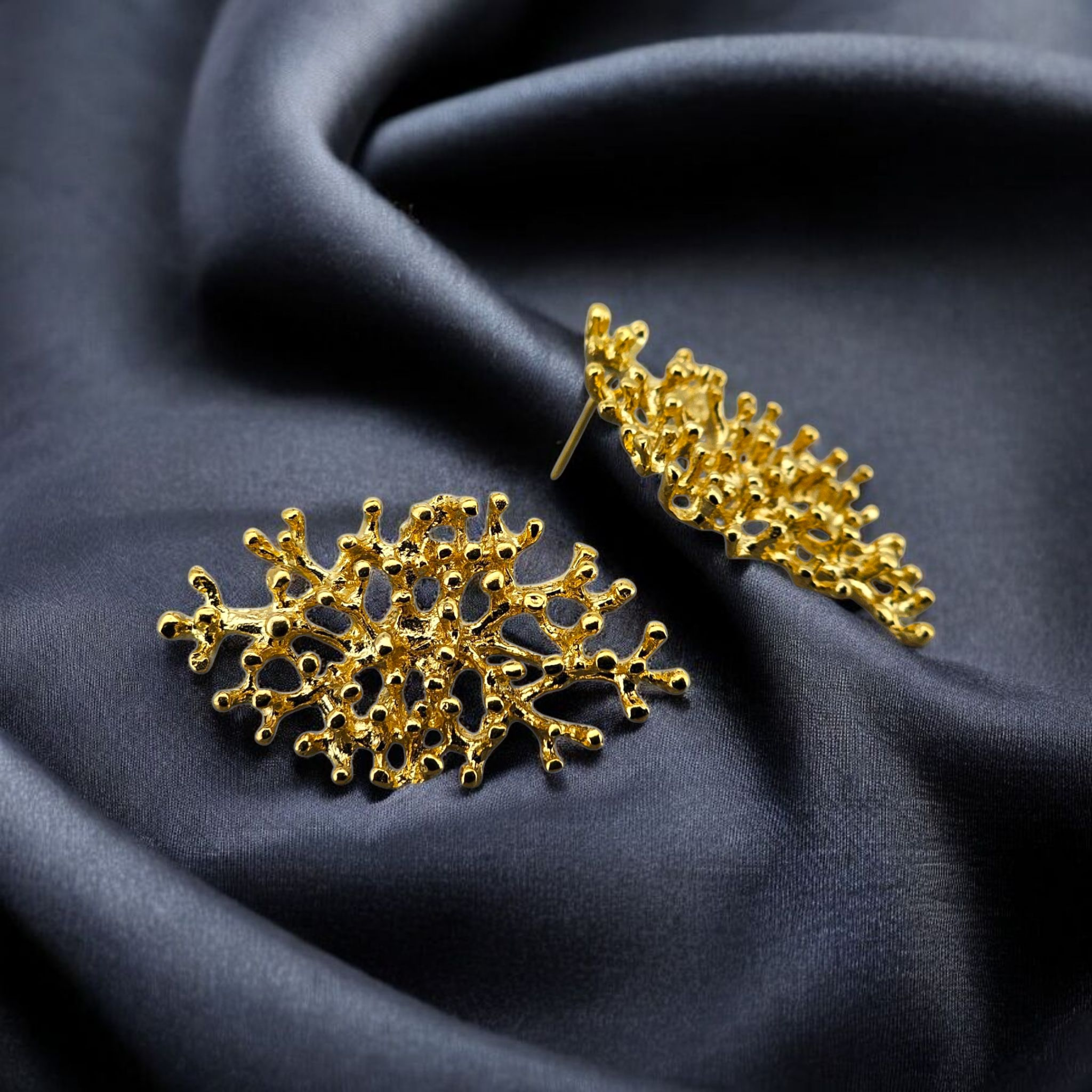 The Tidal Bloom studs from the LONA EDEN collection are shaped like blooming coral branches raw, fluid, and sculptural. Cast in 24k gold-plated brass, they bring the quiet power of the sea to your ears. These earrings celebrate imperfection as beauty, echoing the rhythm of tides and the forms of living reefs. Light, grounded, and full of movement, they’re made for women who feel most like themselves in nature’s flow.