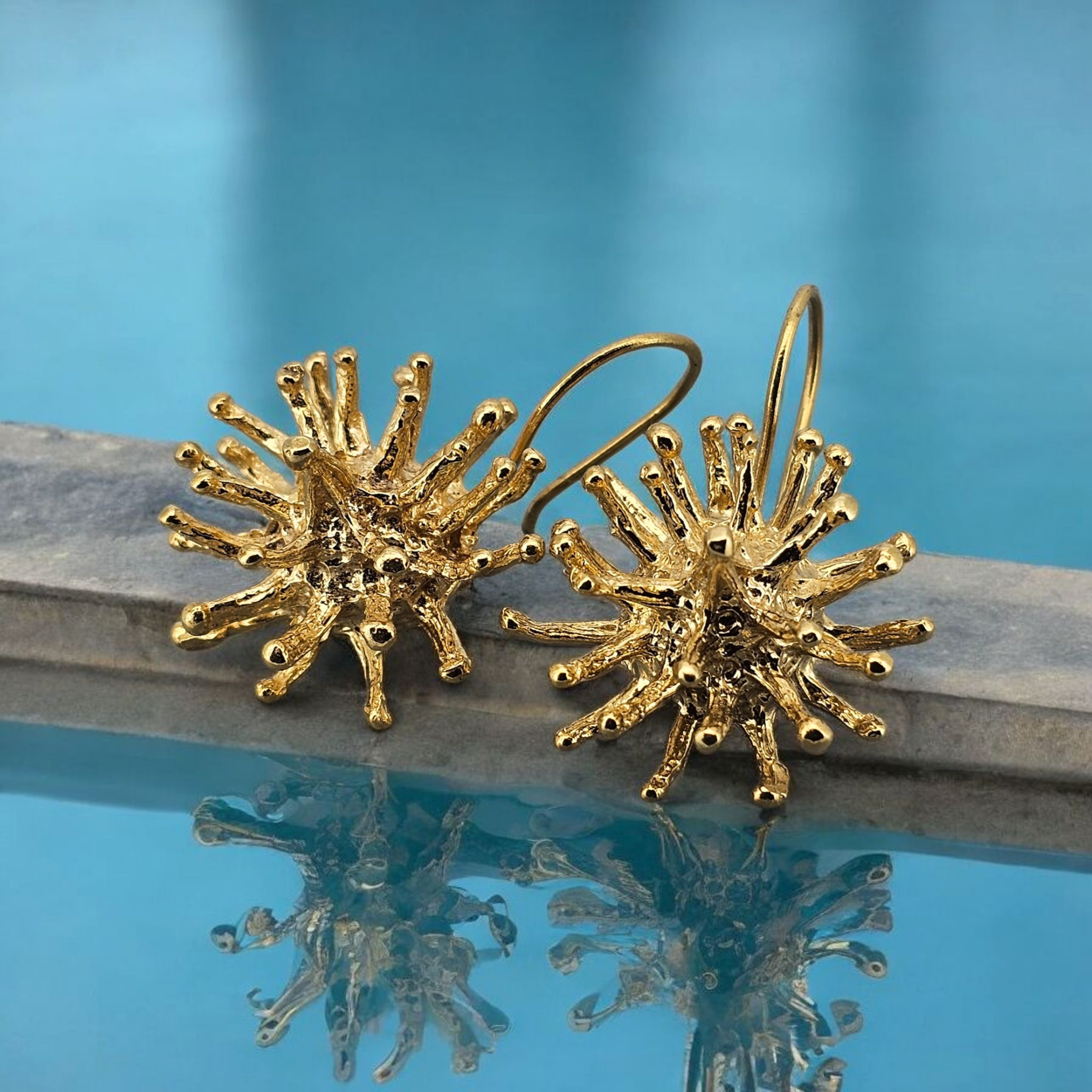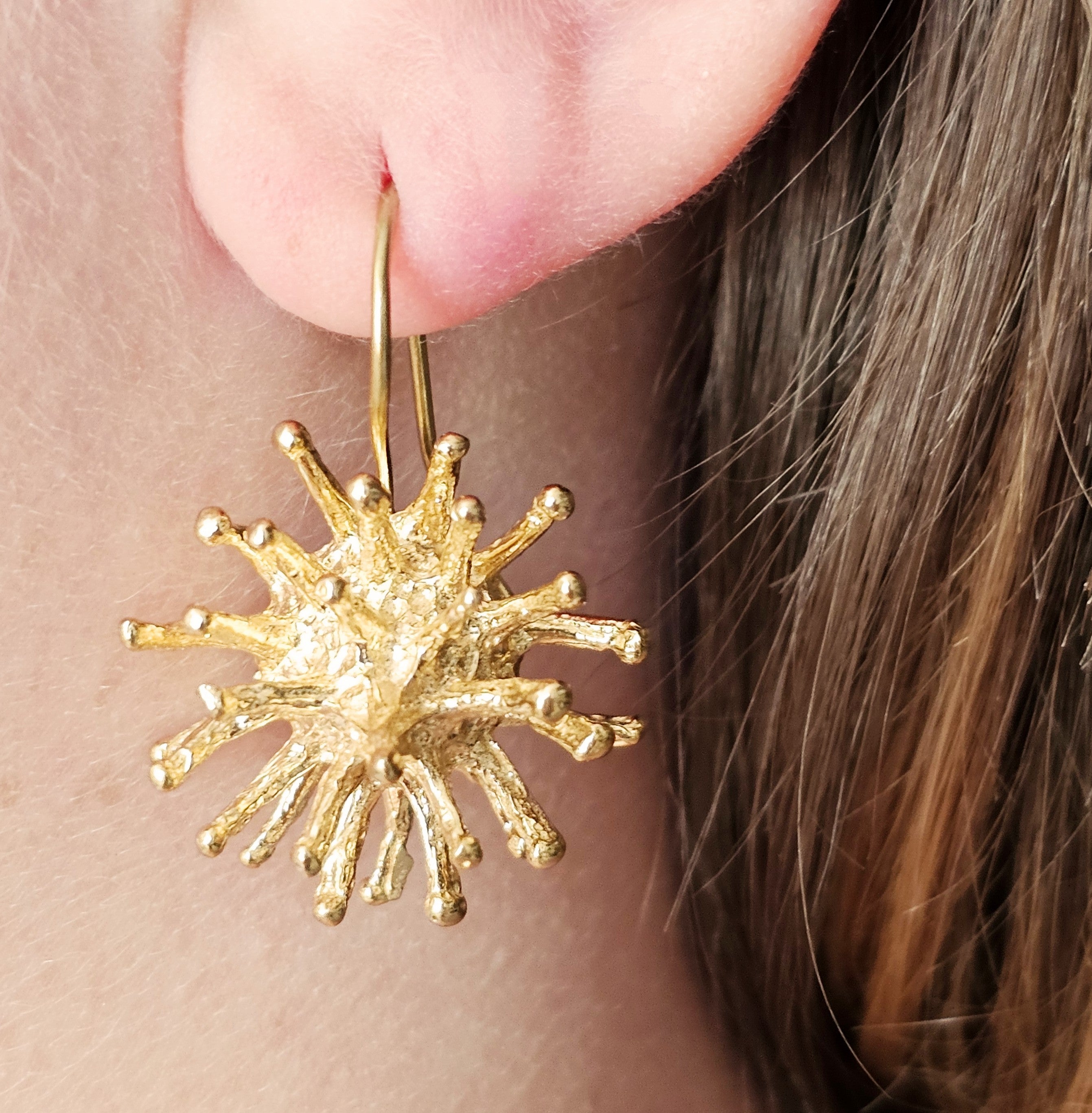 Urchin Glow is raw elegance a sculptural form that echoes the sea urchin’s quiet armor. Cast in textured brass and plated with 24k gold, this earring holds light in its grooves and shadows, glowing from within like something ancient and alive. The form feels found rather than made spiky yet soft, as if grown over time.