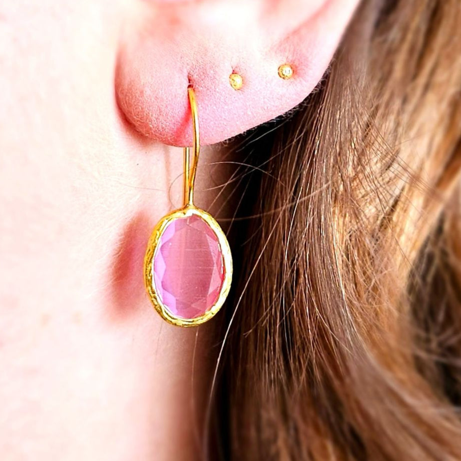 Glow Drop – Pink is a quiet celebration of softness and resilience. The pale rose cateye glows like first light tender, luminous, and full of clarity. Available in four sizes (XS, S, M, and L), this earring shifts with your rhythm: barely-there and minimal, sculptural and serene, or bold with poetic flair.