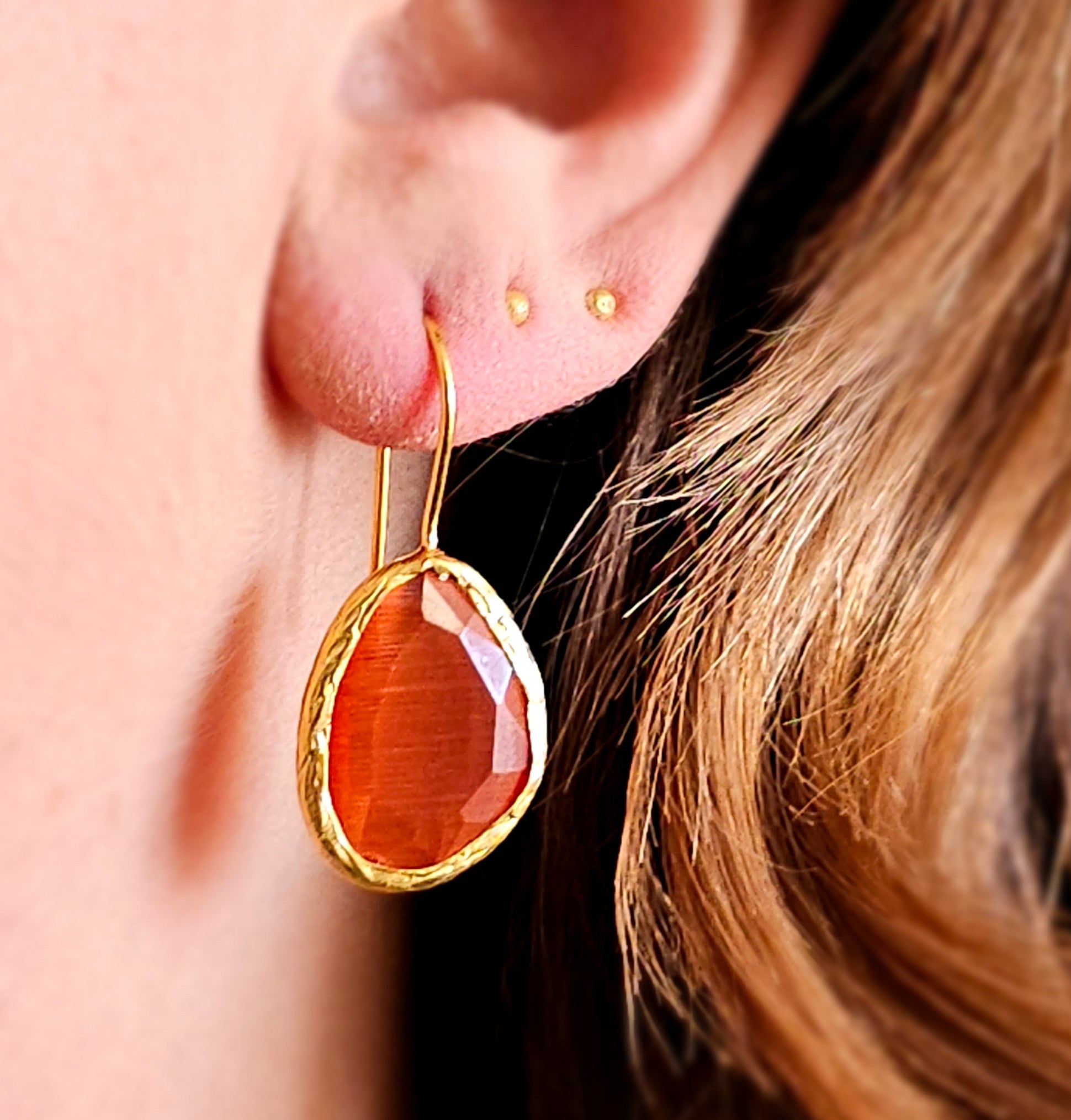 Glow Drop Orange-Red is a spark in stillness. The vibrant cateye stone blends orange warmth with red intensity, glowing like a slow flame. Available in three sizes (S, M, and L), this drop shifts from subtle heat to bold radiance always expressive, never loud.