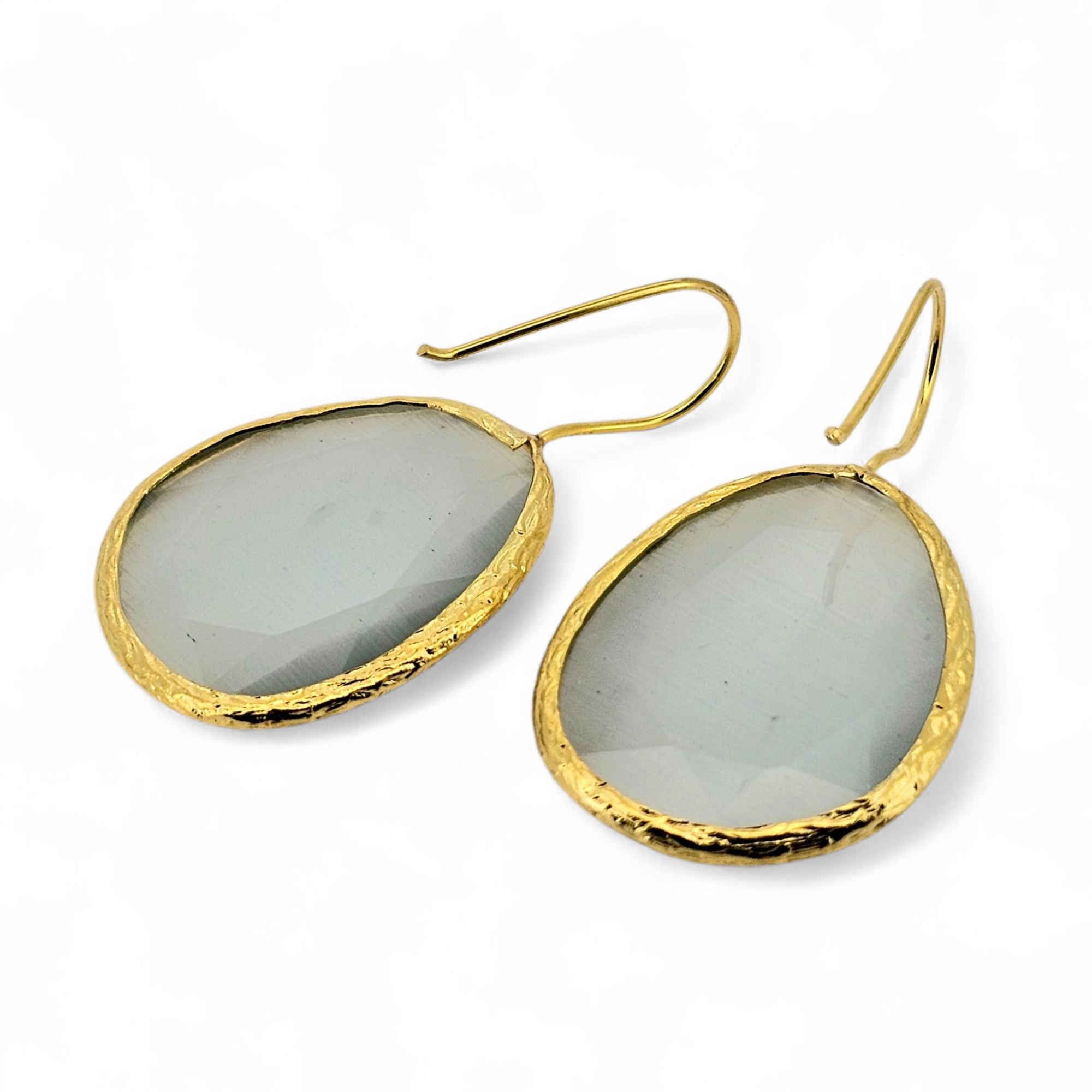 Purple Grey is mysterious, refined, and softly dramatic. The cateye stone shifts between lilac smoke, stormy dusk, and muted silver elegant, layered, and full of quiet depth. Available in four sizes (XS, S, M, and L), this earring moves between subtle minimalism and bold sculptural presence, depending on scale.
