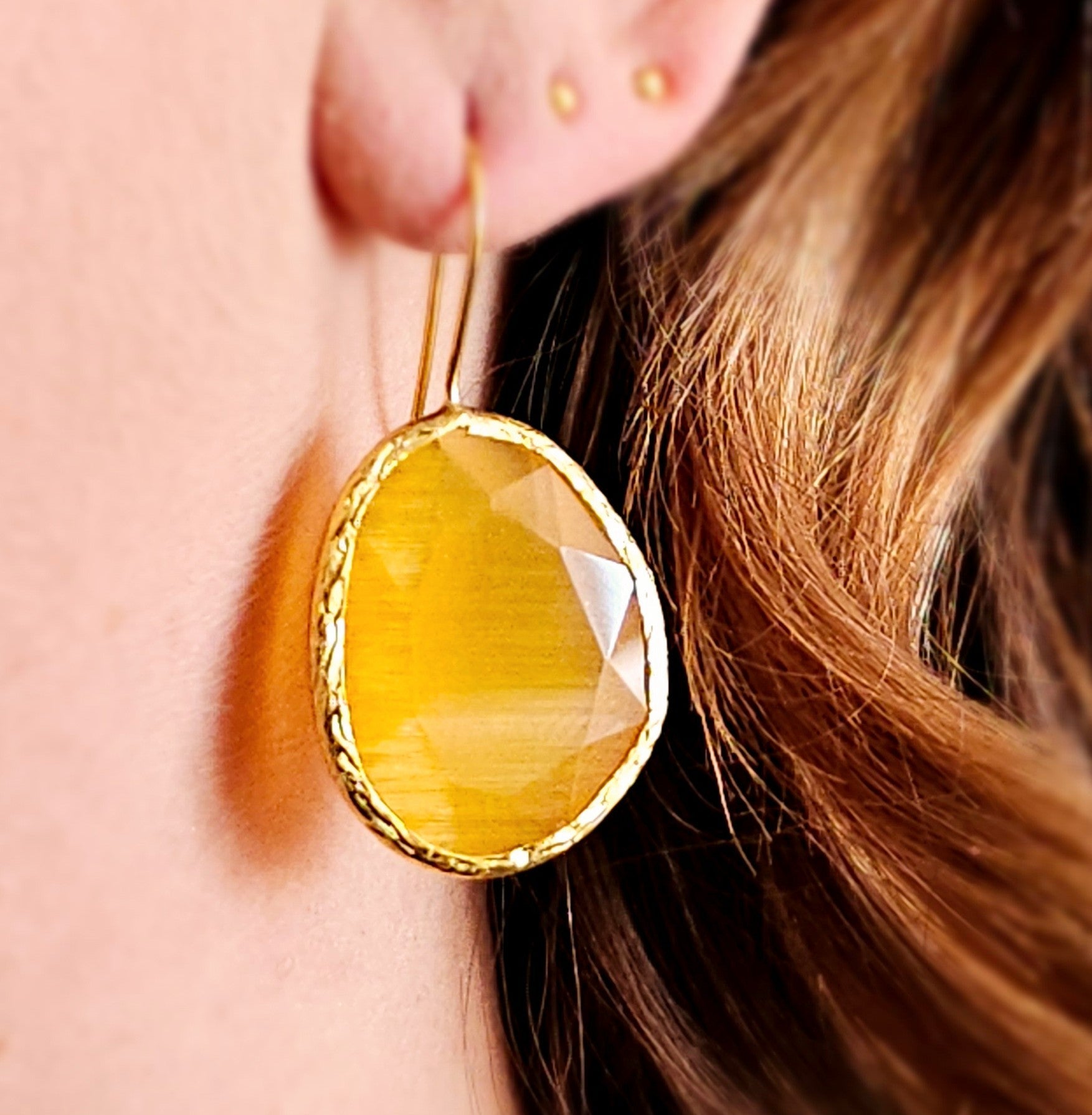 Glow Drop – Yellow is a spark of joy bright, luminous, and full of life. The yellow cateye stone catches light like citrus or sun on skin: zesty, warm, and unapologetically alive. Available in four sizes (XS, S, M, and L), this earring flows with your energy: minimal and sunny, sculptural and bold, or radiant with golden cheer.