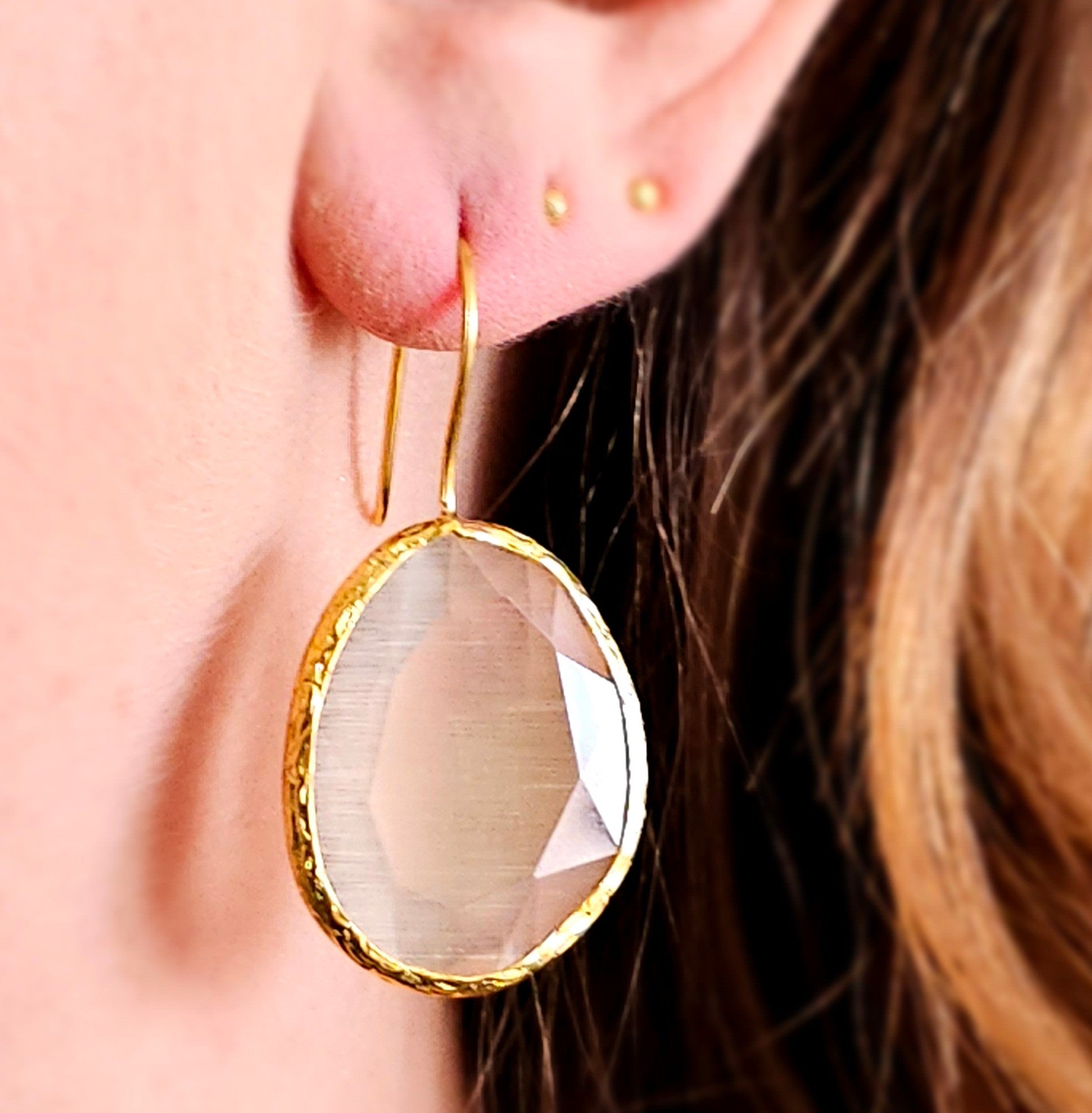 Glow Drop – Nude is softness made visible. The warm nude cateye stone glows with a skin-like warmth subtle, earthy, and effortlessly intimate. Available in four sizes (XS, S, M, and L), this earring adapts like second skin: minimal and bare, sculptural and serene, or bold with understated sensuality.