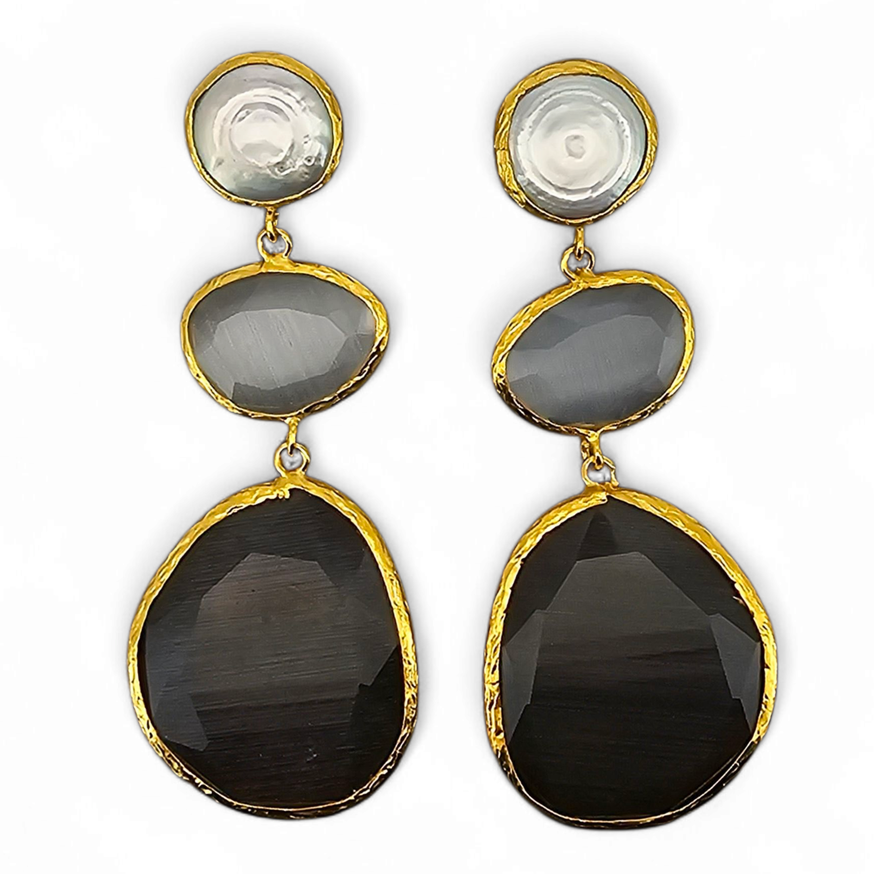 Glow Line Pearl • White • Black is a meditation in contrast. The softness of pearl and white cateye stones meets the grounding depth of black, forming a vertical composition that feels timeless and intentional. A glow that moves from light to shadow, always in flow.
