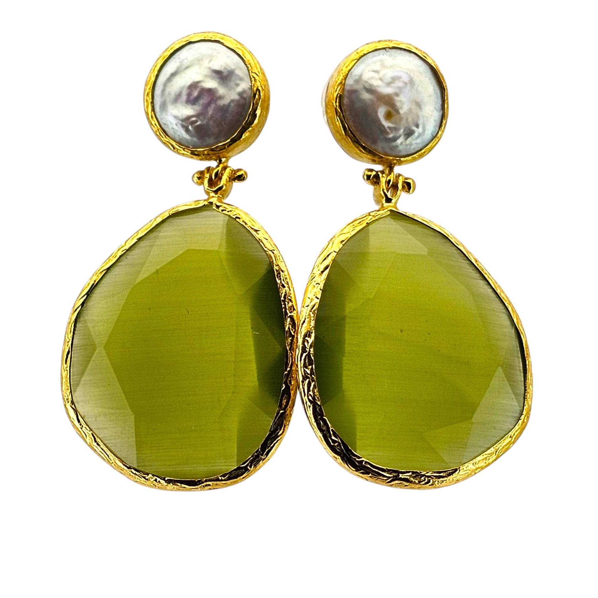 Twin Flow – Pearl & Olive brings together two grounded energies in quiet harmony. The soft shimmer of freshwater pearl meets the muted green glow of olive cateye, forming a vertical duo that feels serene, intuitive, and deeply balanced. It's a natural kind of grace subtle, steady, and soulfully refined.
