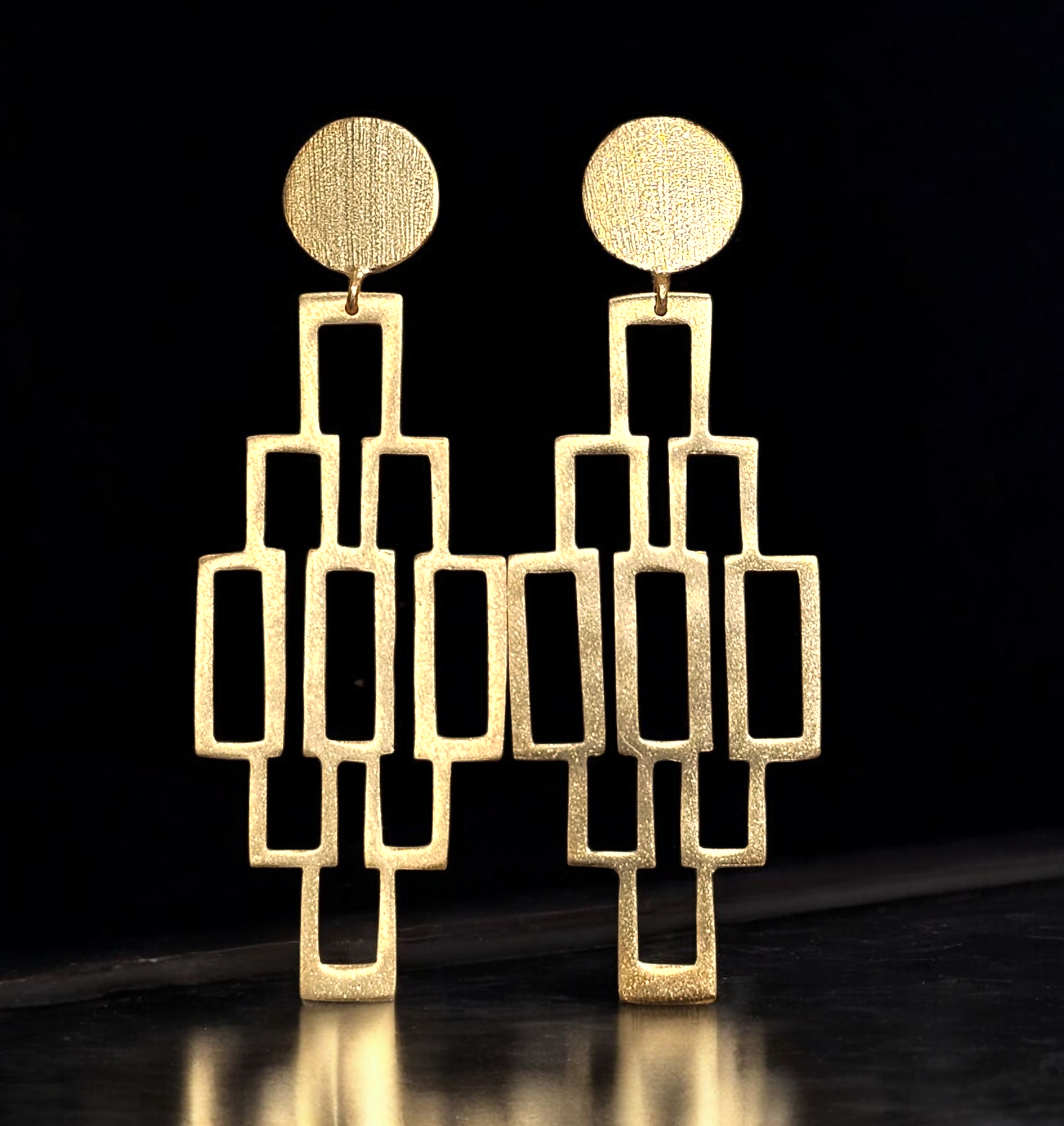 Graphic, grounded, and built to make a statement Linear Force is all about direction and clarity. Elongated golden rectangles are stacked with intention, forming a sculptural silhouette that moves with purpose. The geometry is minimal, the presence unmistakable.