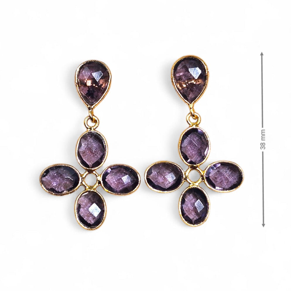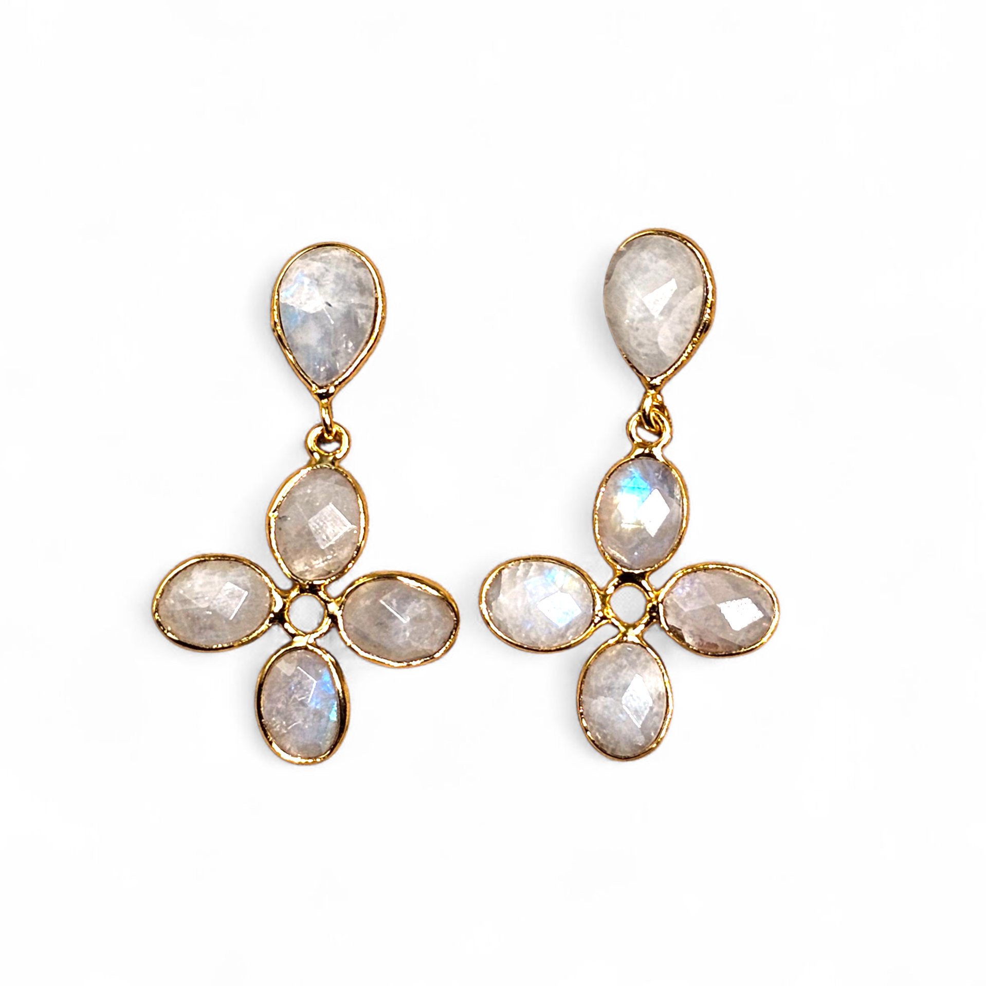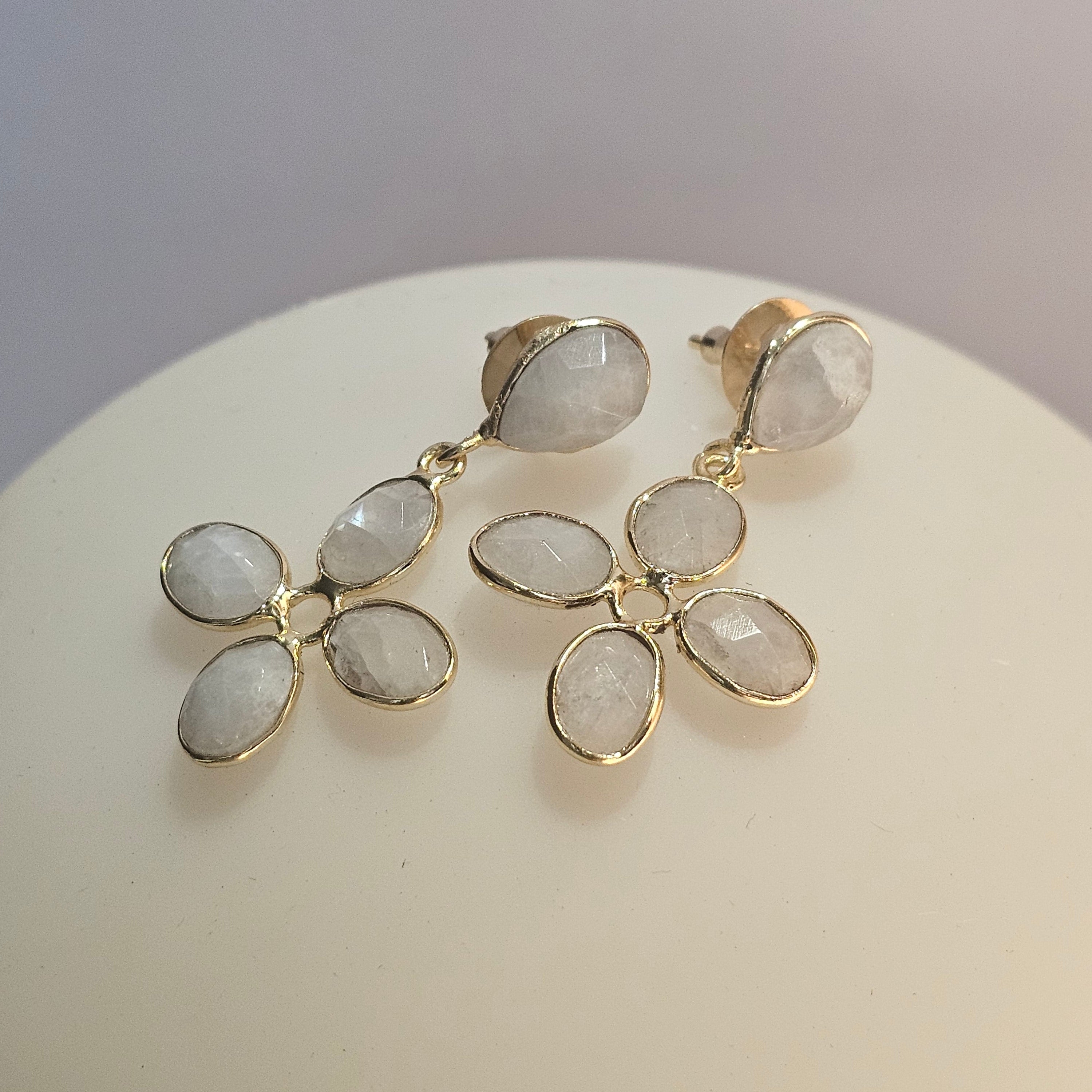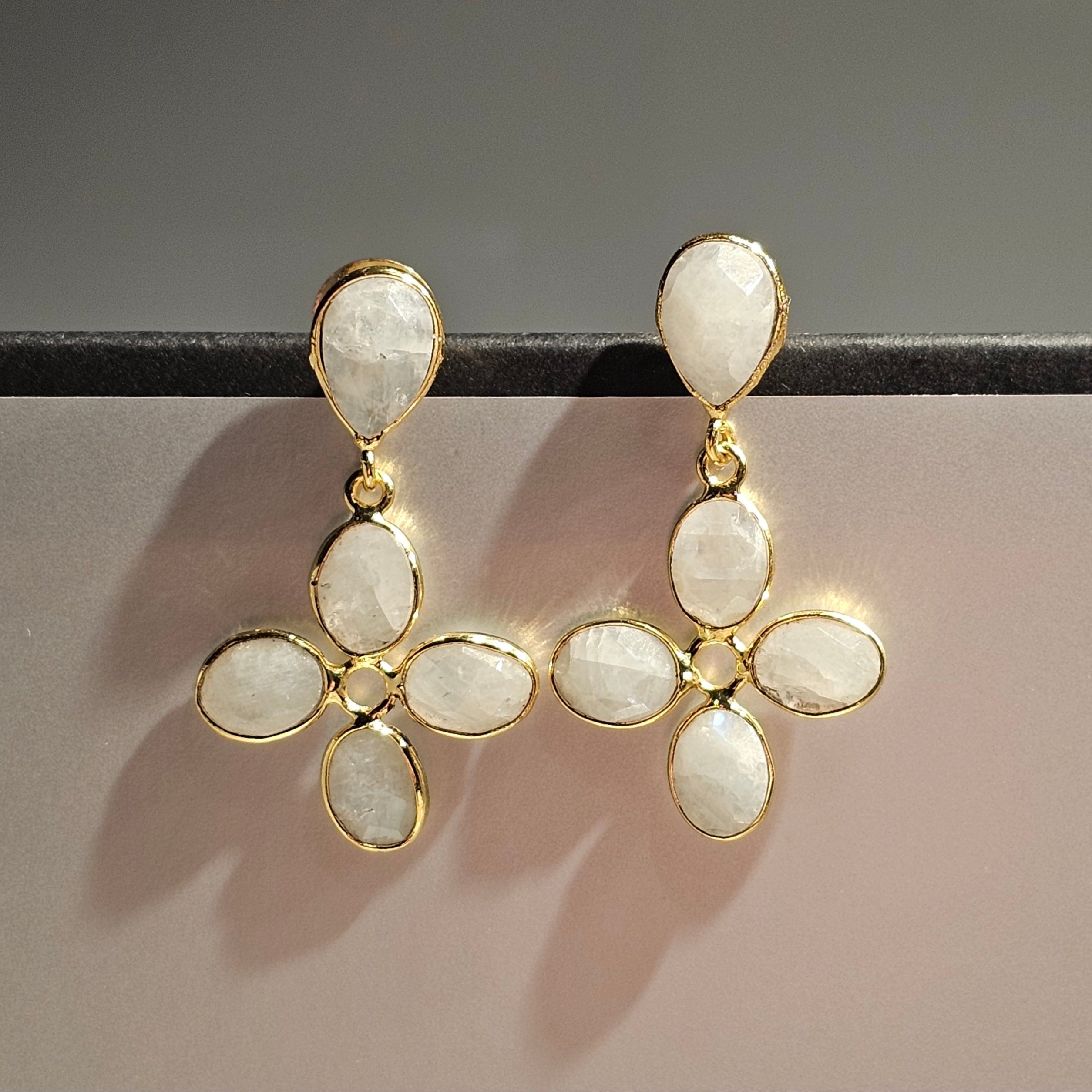 Selene captures the quiet luminosity of the LONA DELICA collection. Four natural moonstones are delicately arranged in a vertical design with a subtle stud at the top, reflecting light in soft, shifting tones. Handcrafted in gold-plated brass, these earrings combine understated elegance with everyday wearability. At 3.8 cm and only 2.7 grams, Selene feels almost weightless a touch of moonlight that moves with you.
