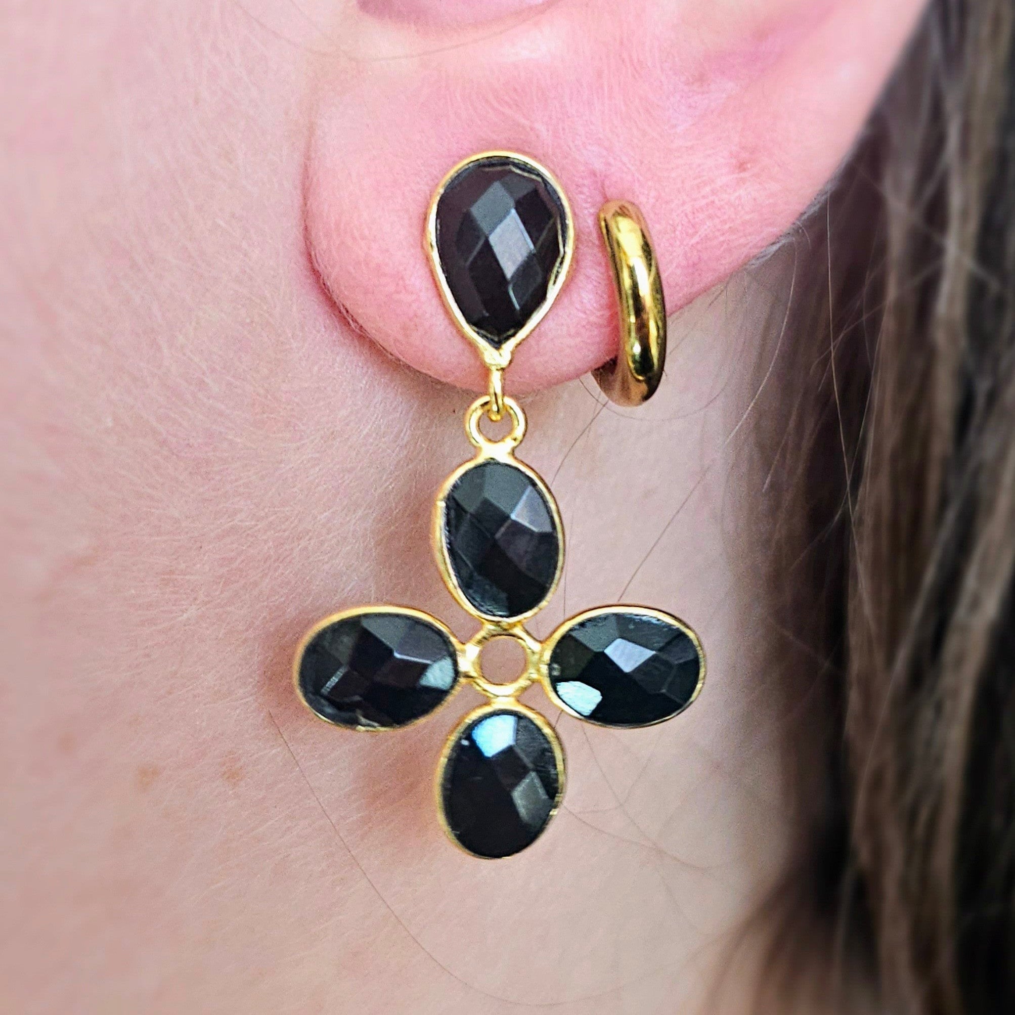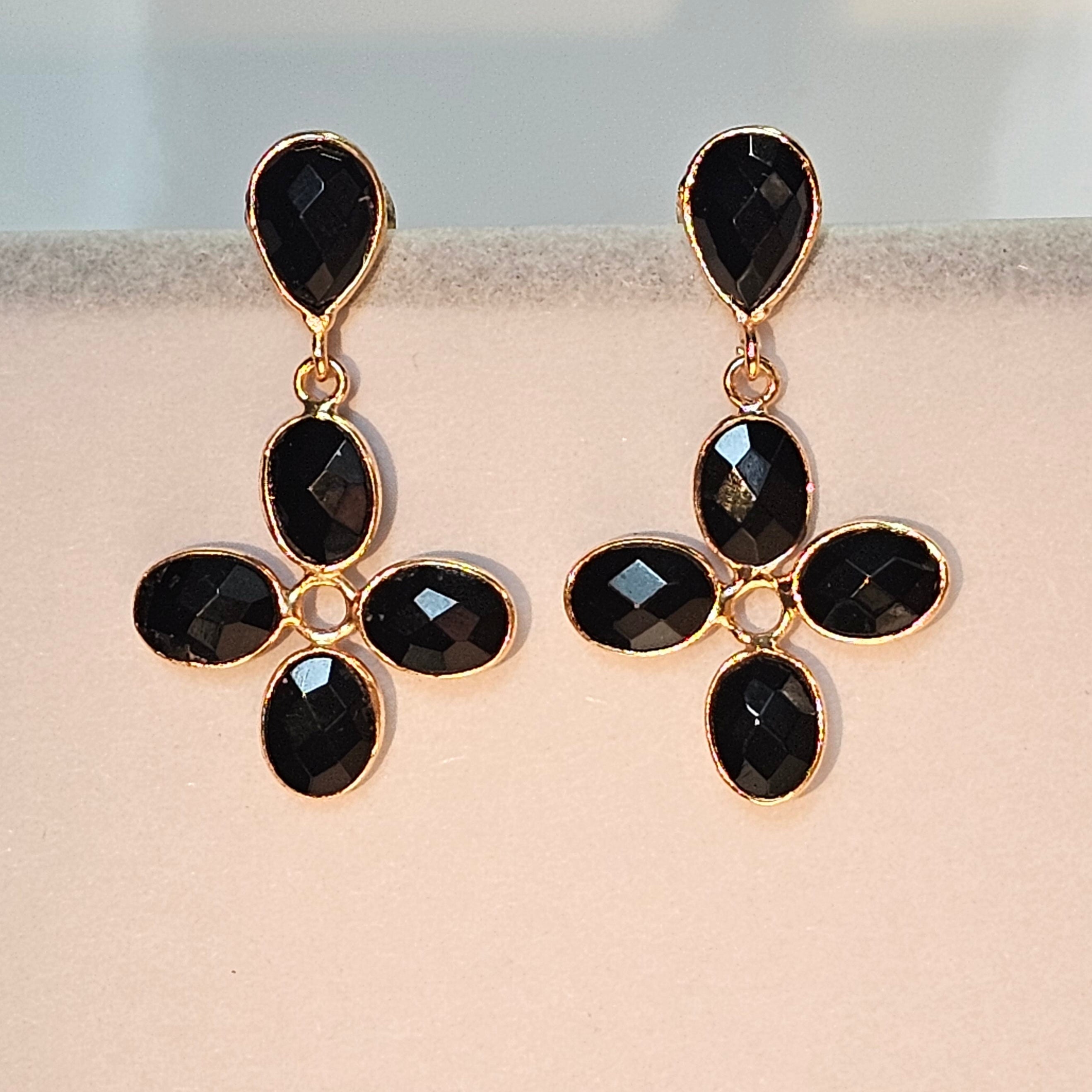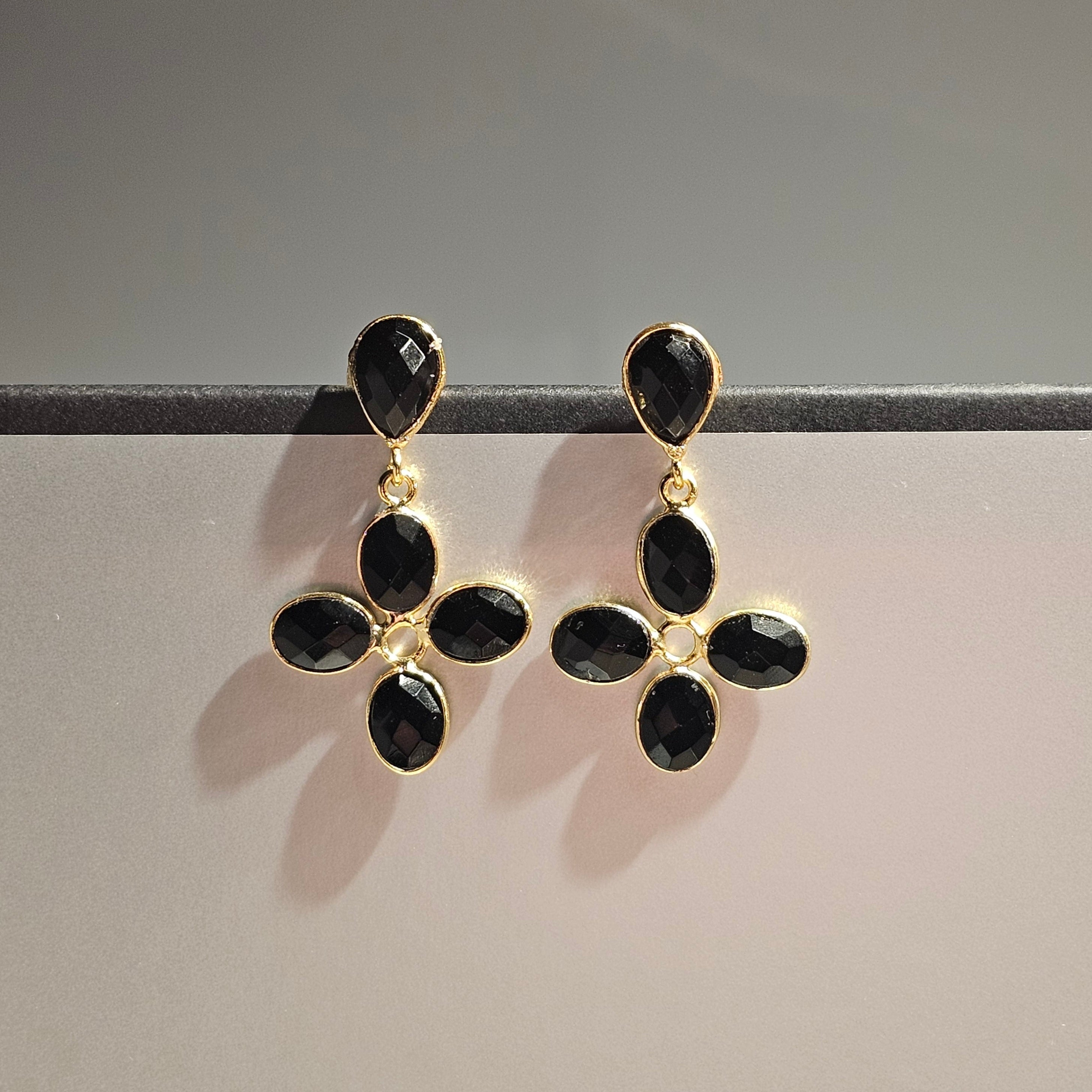 Noira embodies the understated strength of the LONA DELICA collection. Four polished black onyx stones are delicately linked in a fine vertical line, topped with a small stud for balance and structure. The deep black stones create a subtle contrast against the gold-plated brass setting, giving these earrings a timeless, modern edge. Despite their sculptural look, they weigh only 2.7 grams effortless comfort with quiet power.