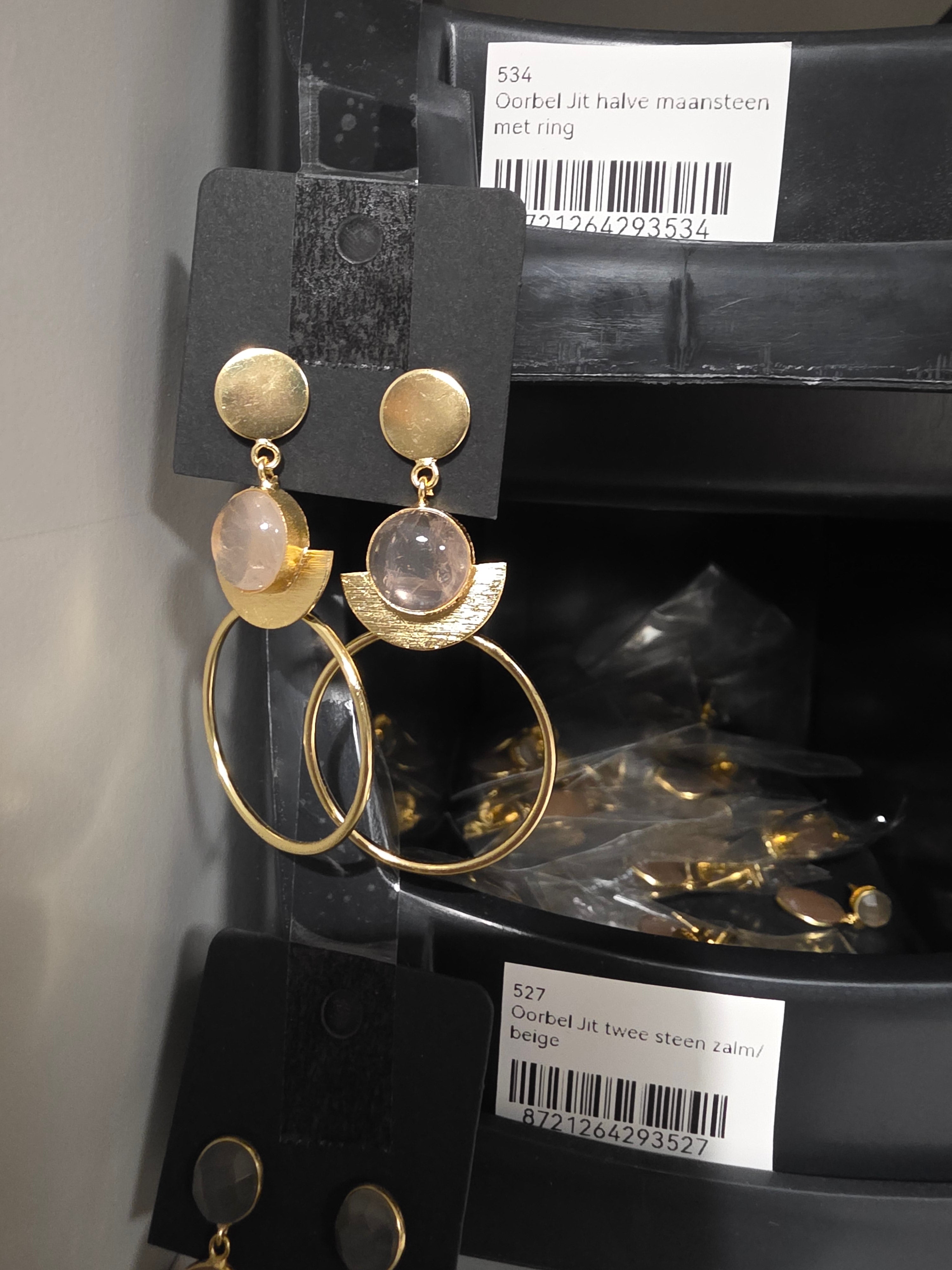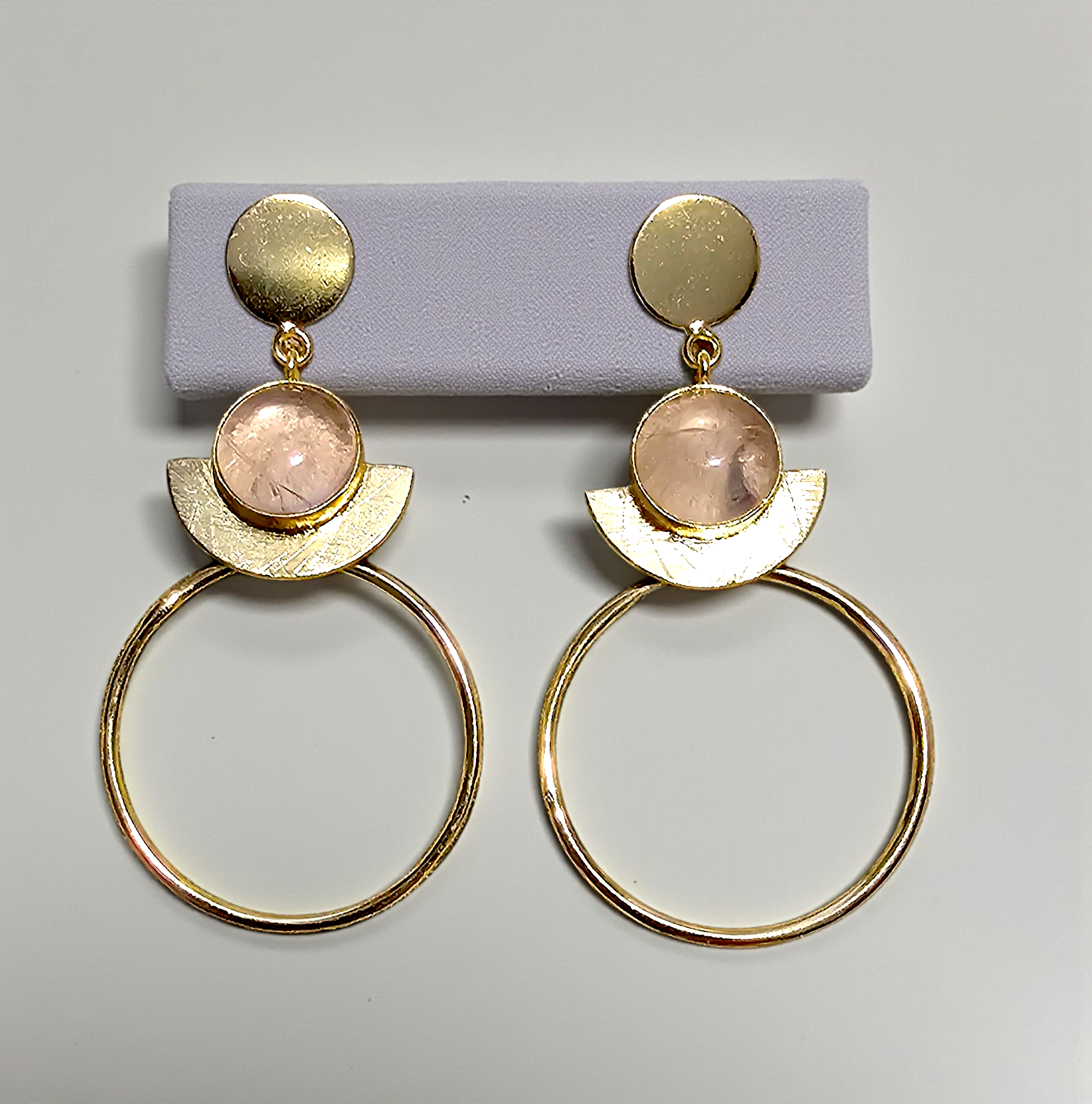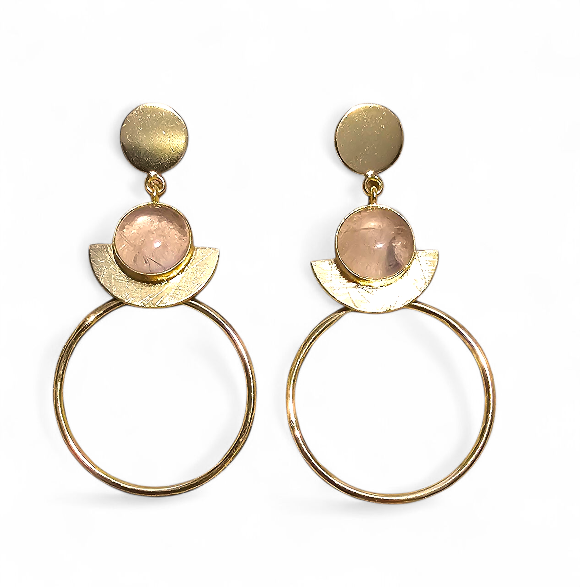 The Rose Orbit Earrings – Rose Quartz combine flowing geometry with the gentle beauty of rose quartz. A golden arc embraces a delicate ring, centered by a natural rose quartz that radiates softness and calm energy. Each pair is handcrafted in India, making every piece unique. With their light weight and refined design, these earrings are perfect to elevate both everyday outfits and special occasions.