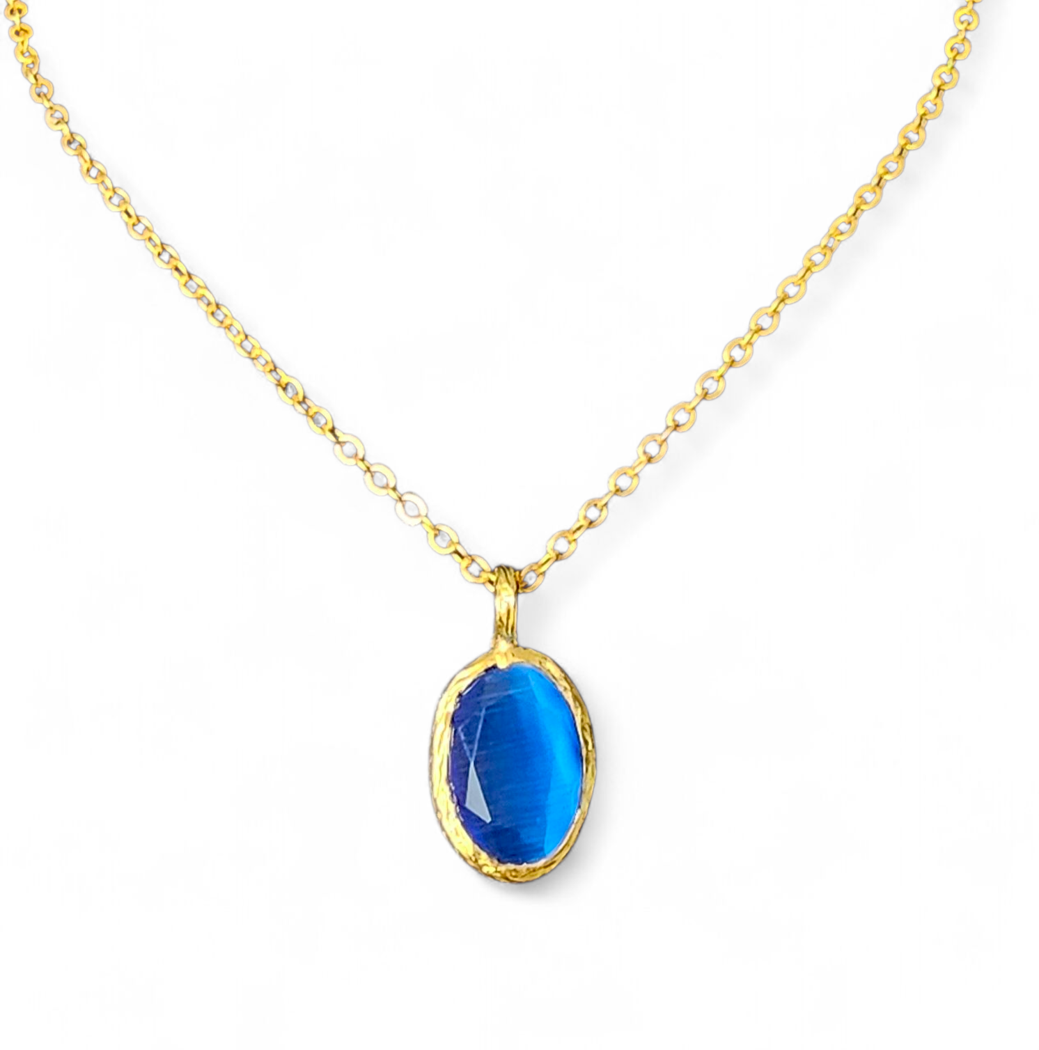 Glow Necklace Azure features a smooth oval cateye stone (10 × 14 mm) in vibrant azure blue, reflecting the light with its signature shifting stripe. The stone is set on a delicate adjustable chain (42–45 cm), making it easy to style with different necklines. At just 3.6 g, it’s light and comfortable to wear every day.