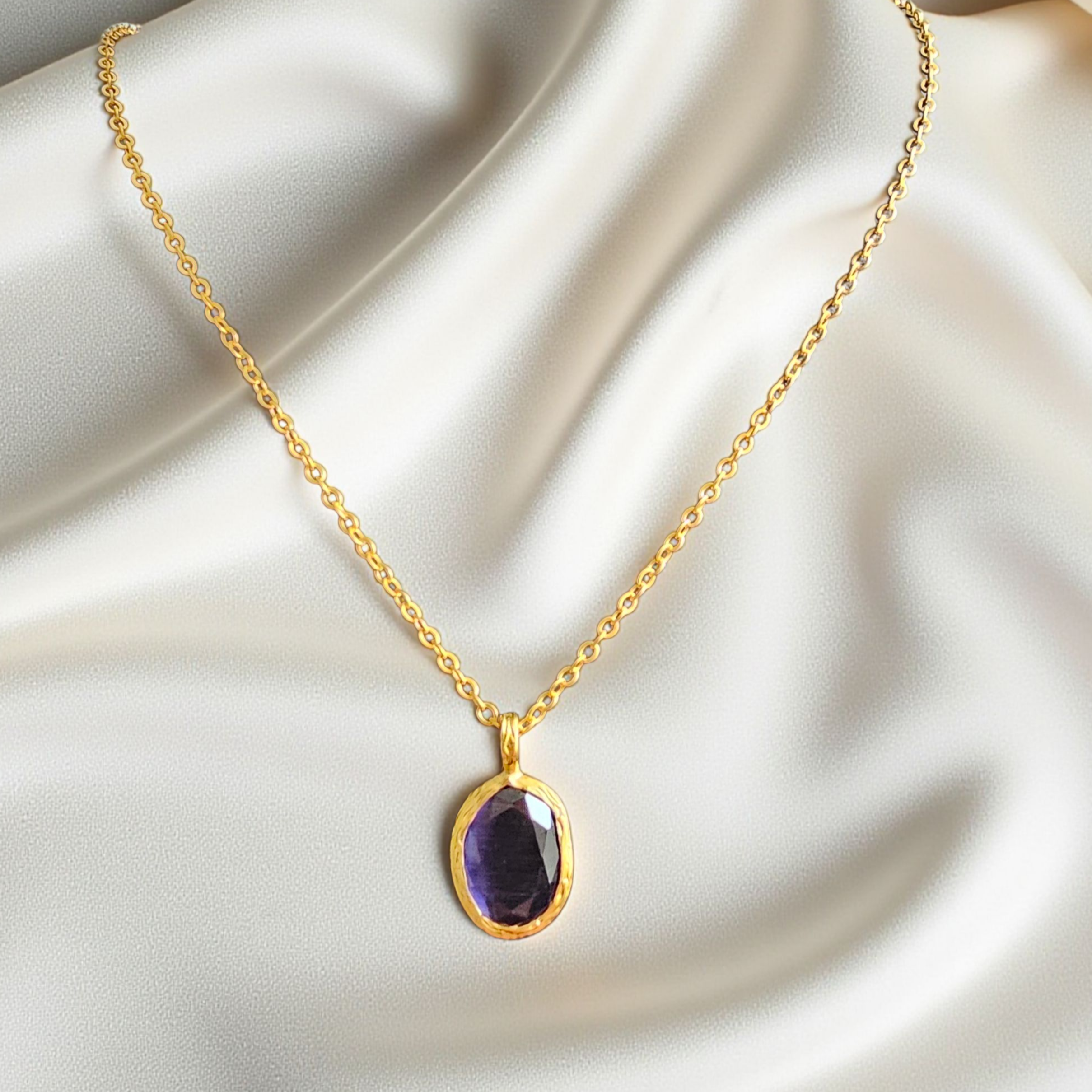 The Glow Necklace Purple Grey is set with a smooth oval cateye stone (10 × 14 mm) in a unique blend of purple and grey tones. Its signature shifting stripe moves with the light, adding subtle depth and sophistication. Hanging from a fine adjustable chain (42–45 cm), this necklace is as versatile as it is elegant refined enough to wear solo, yet easy to combine with other pieces for a layered look. At only 3.6 g, it feels light, effortless, and comfortable all day long.