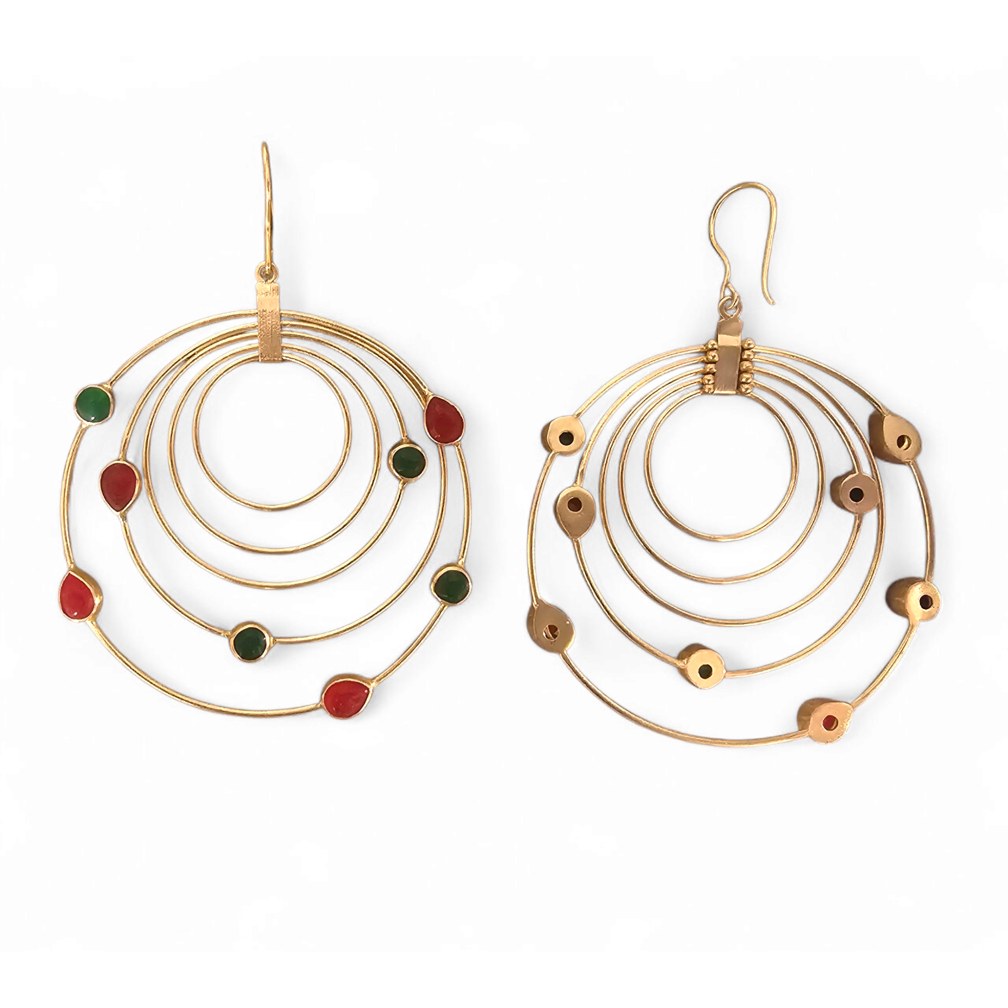 Five bold, golden circles orbit a natural stone, drawing energy into a powerful center. The Orbit Cluster earrings channel a dynamic force cosmic, grounded, and deeply intentional. Each ring represents one of the elements: earth, fire, water, air, and ether. Together, they embody the complexity and presence of those who dare to take up space in life, in love, and in their own story.