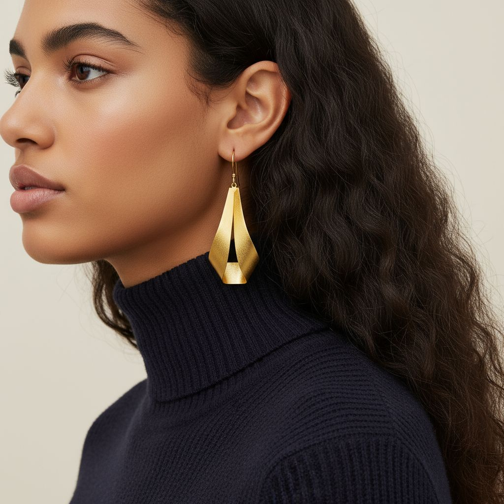 Lint flows with the graceful rhythm of movement bold, sculptural, and endlessly expressive. These earrings capture the essence of the LONA BOLD collection: a design that feels powerful yet effortless. Crafted from silver-plated brass with a golden lacquer finish, their ribbon-like form catches the light from every angle. Despite their statement size, they remain remarkably light at only 7.1 grams, offering the drama of volume with the comfort of air.