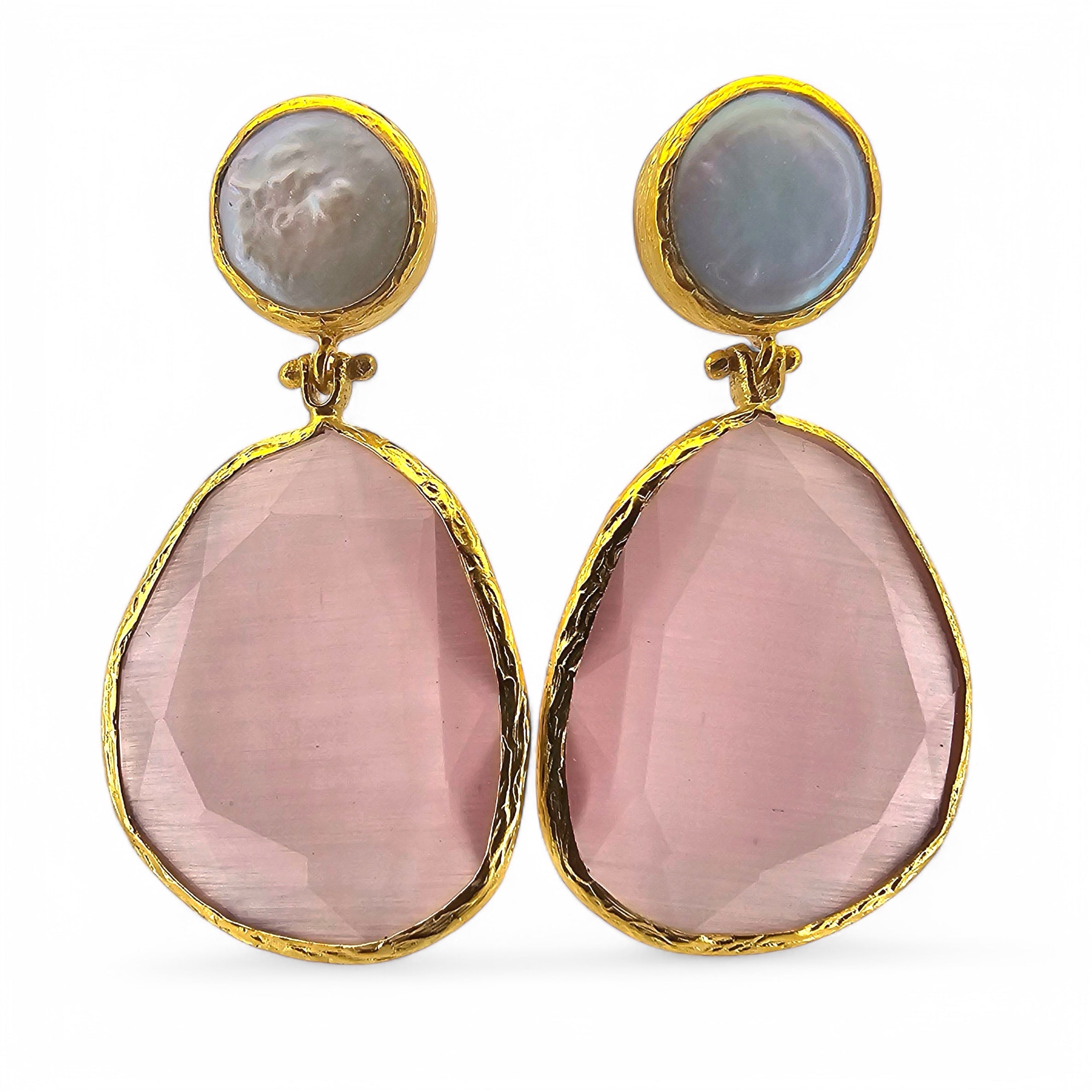 Twin Glow Pearl & Pink is softness doubled a gentle pairing of glow and warmth. One stone shimmers like pearl, the other glows with a nude, skin-like tone. Together they create a subtle shift in light, like early sun on silk. With its sculptural drop and quiet elegance, this single-size earring brings balance, tenderness, and effortless style.