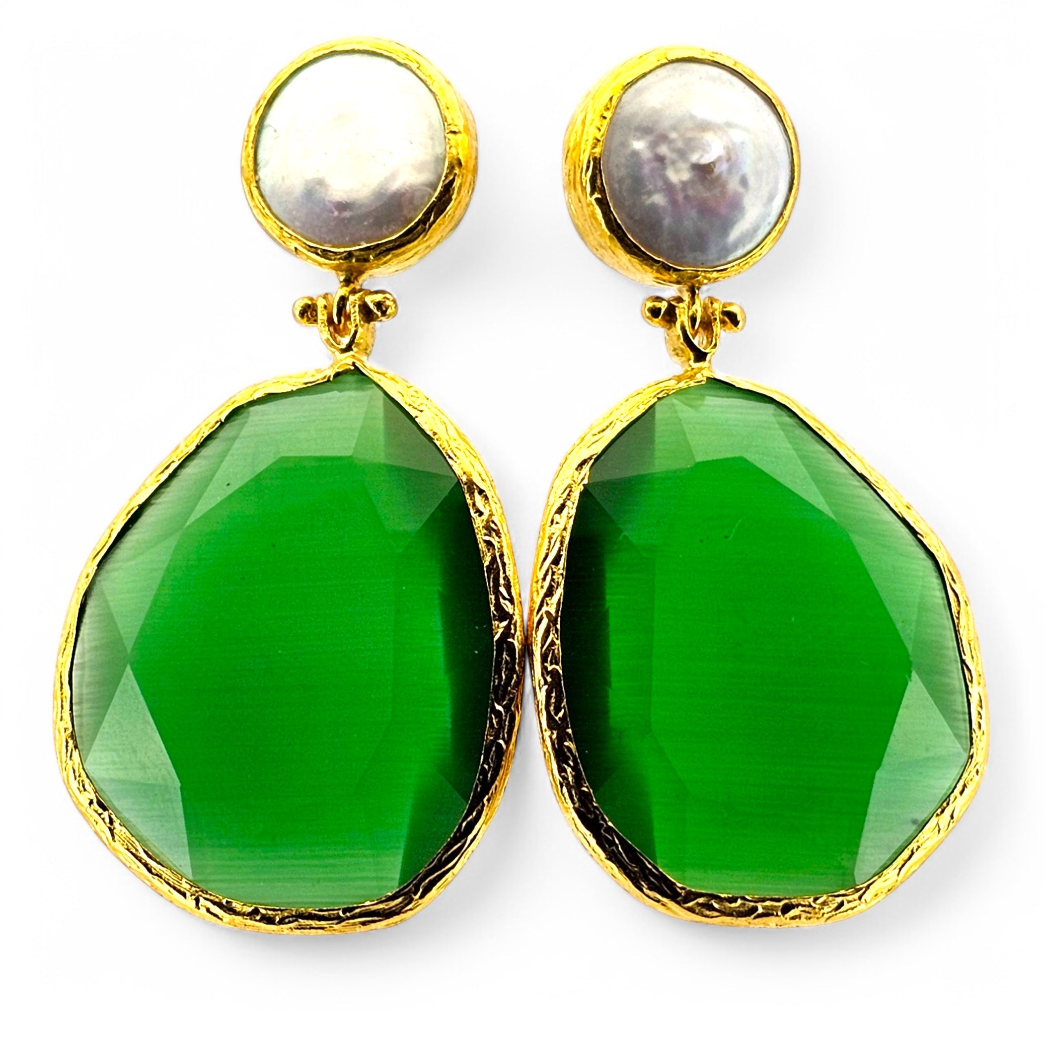 Twin Flow Pearl & Green brings together two gentle forces: the luminous calm of freshwater pearl and the fresh, restorative energy of green cateye. Aligned in a vertical duo, they move in harmony subtle, grounded, and emotionally clear.