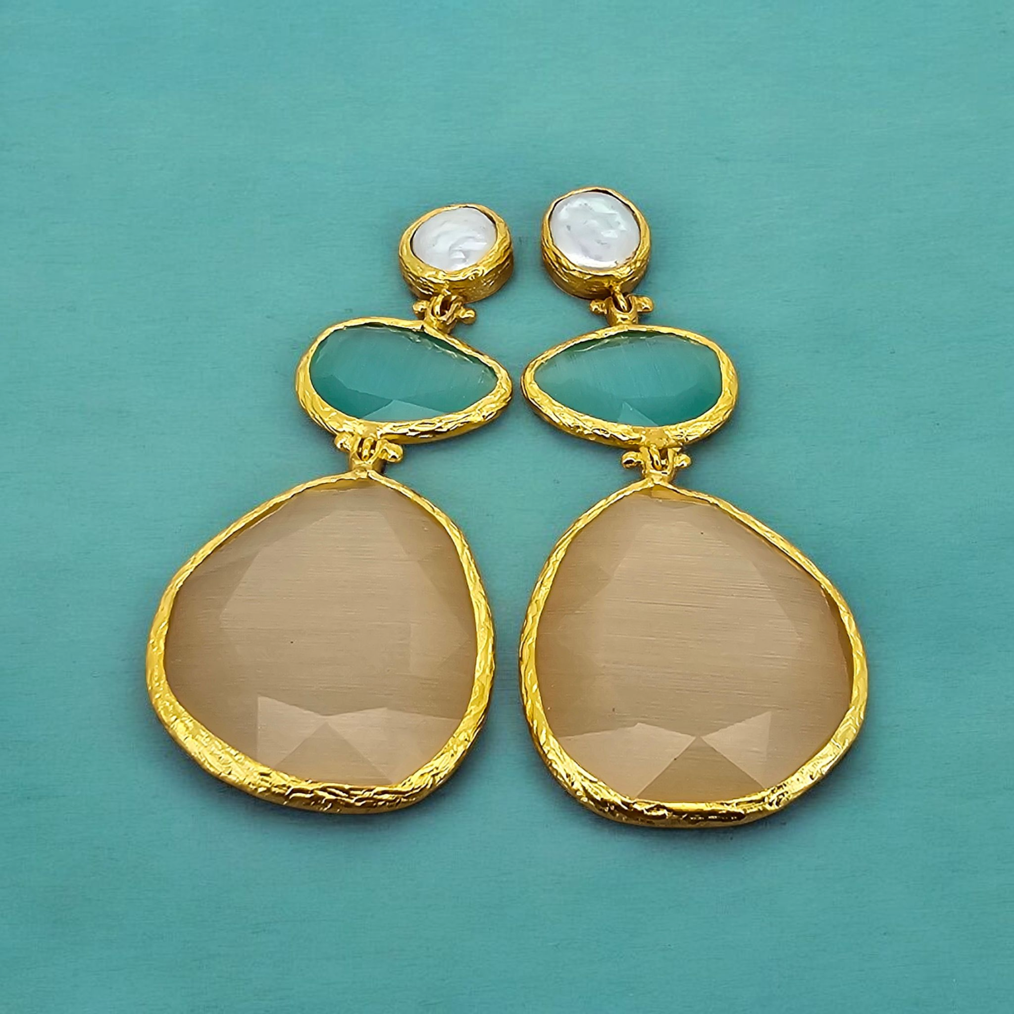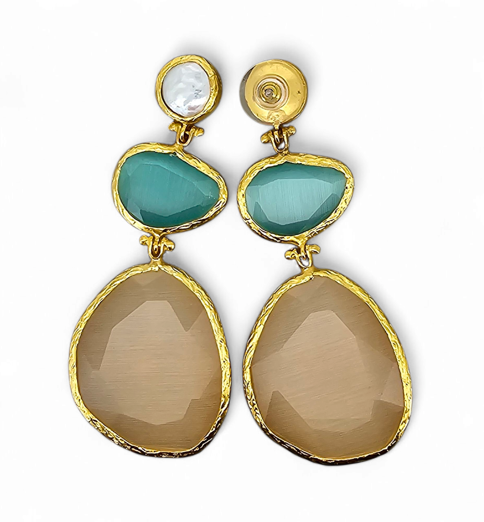 Material: "Made with cateye stones, a freshwater pearl, and 24k gold-plated brass. "