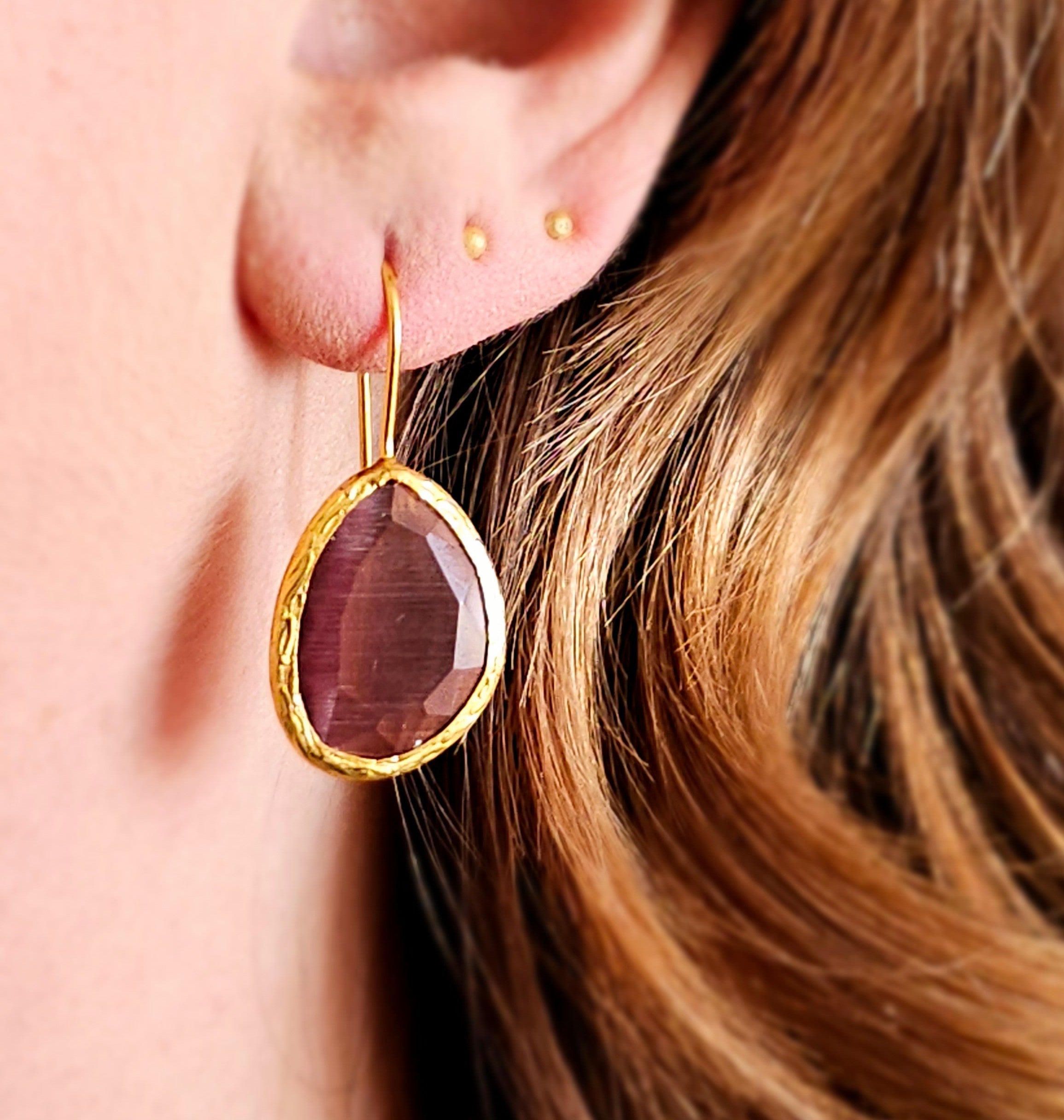 The Glowdrop Aubergine Medium is a refined piece that adds a warm and elegant accent to any look. The deep aubergine cat eye stone shimmers beautifully with the light, while the 24k gold-plated brass setting enhances its timeless design. Handcrafted in Turkey, these earrings are lightweight and versatile perfect for both everyday wear and special occasions.