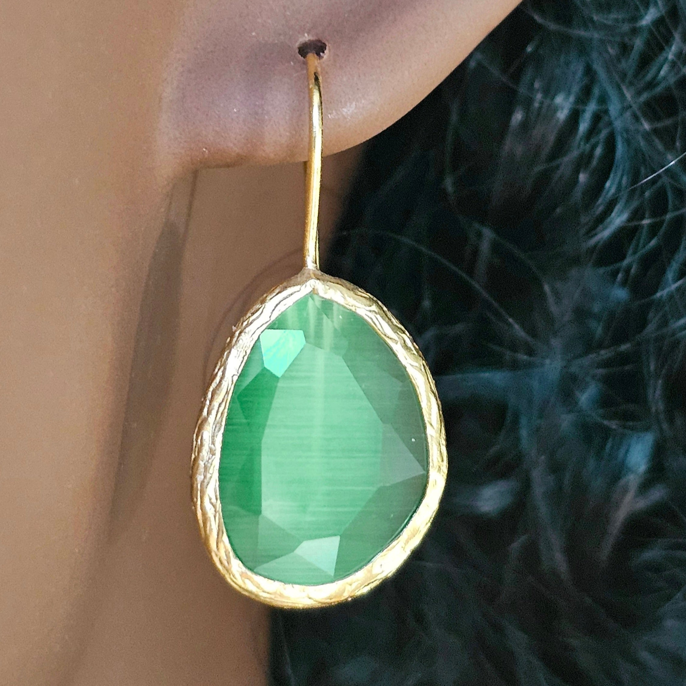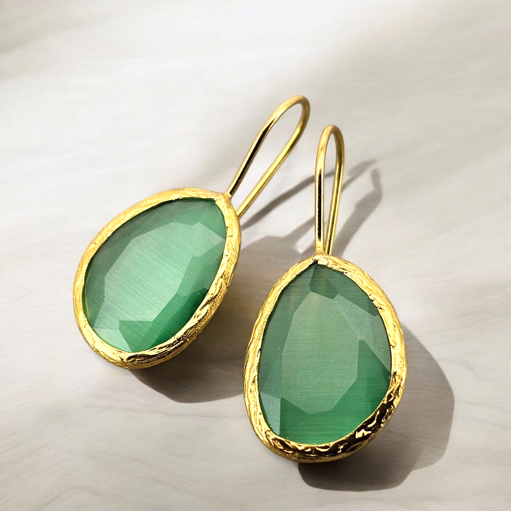 The Glowdrop Light Green Medium brings a soft and refreshing touch of color to your look. The light green cat eye stone shimmers gently in the light, while the 24k gold-plated brass setting adds a timeless, minimal finish. Handcrafted in Turkey, these earrings are lightweight and versatile perfect for everyday wear and special occasions alike.