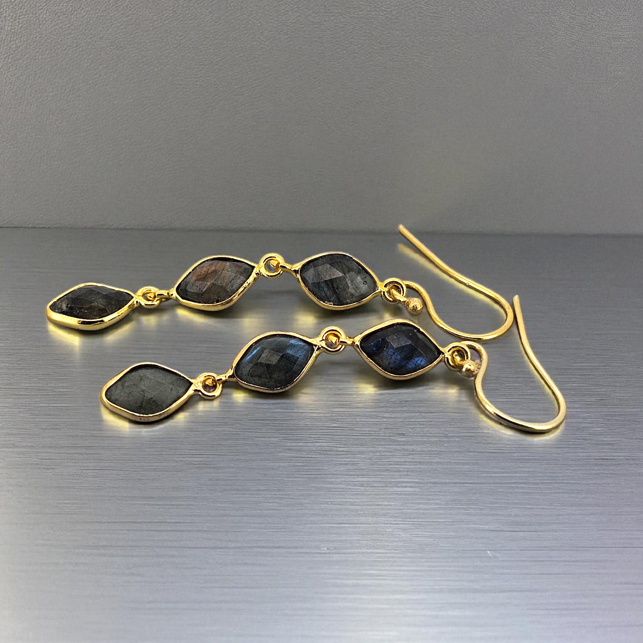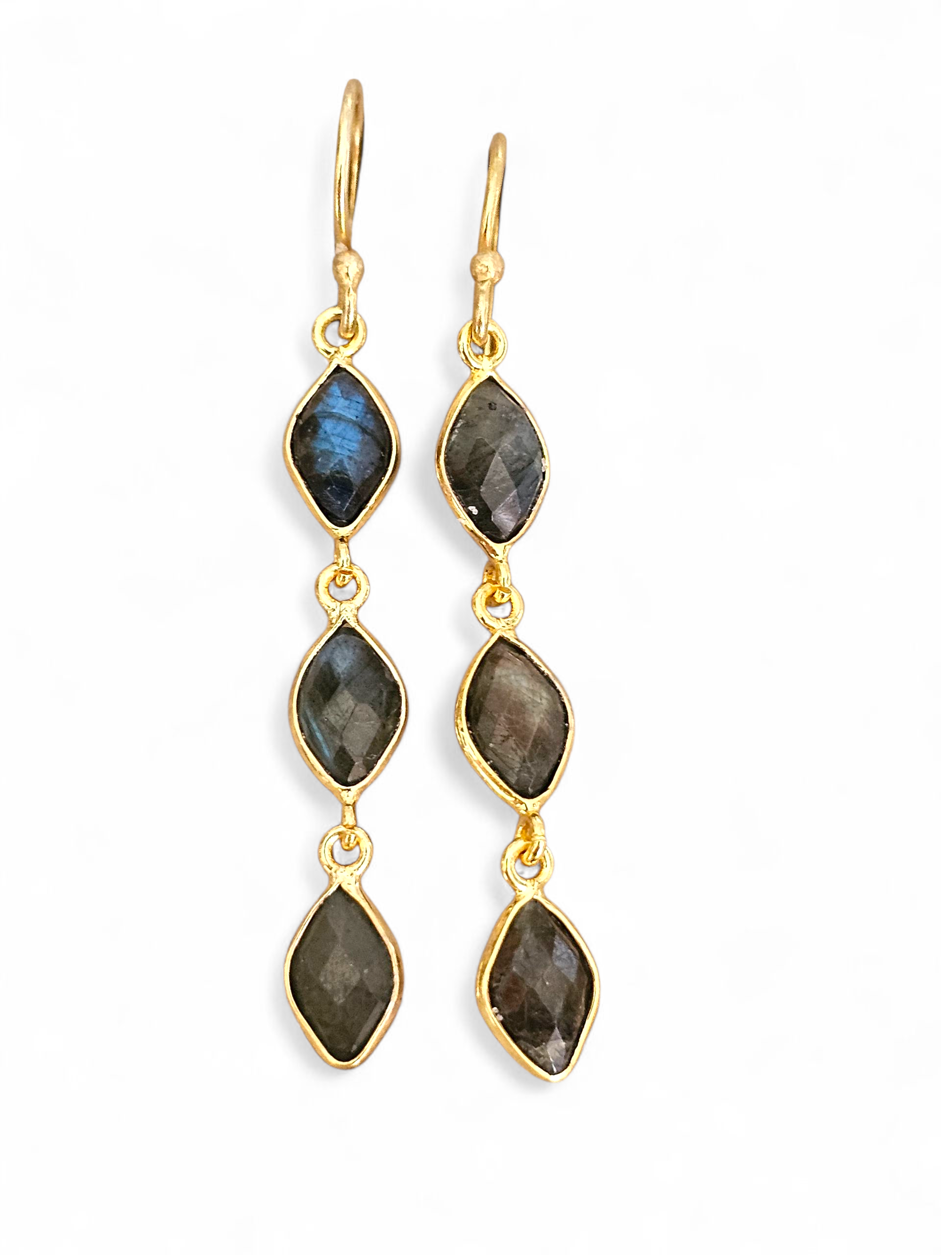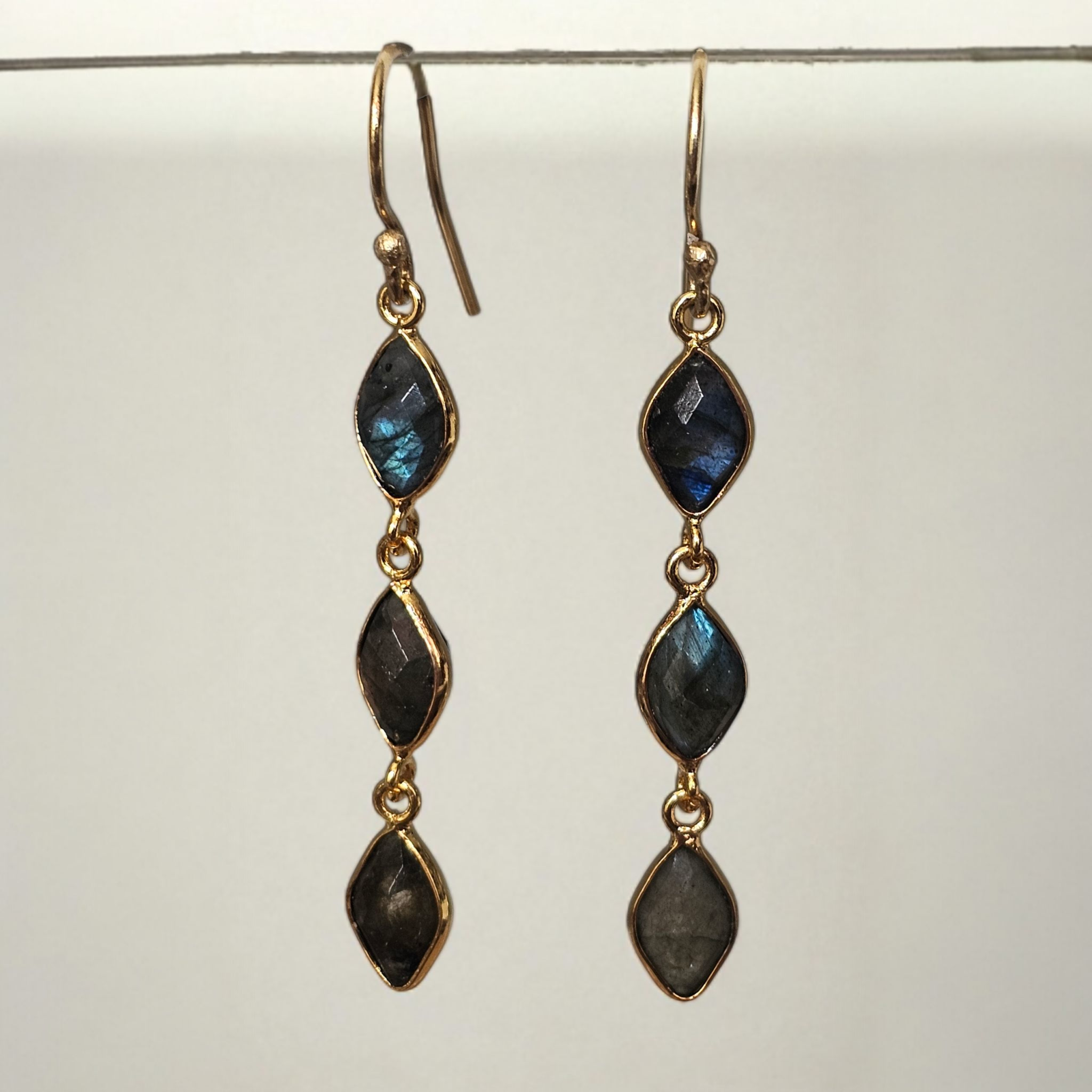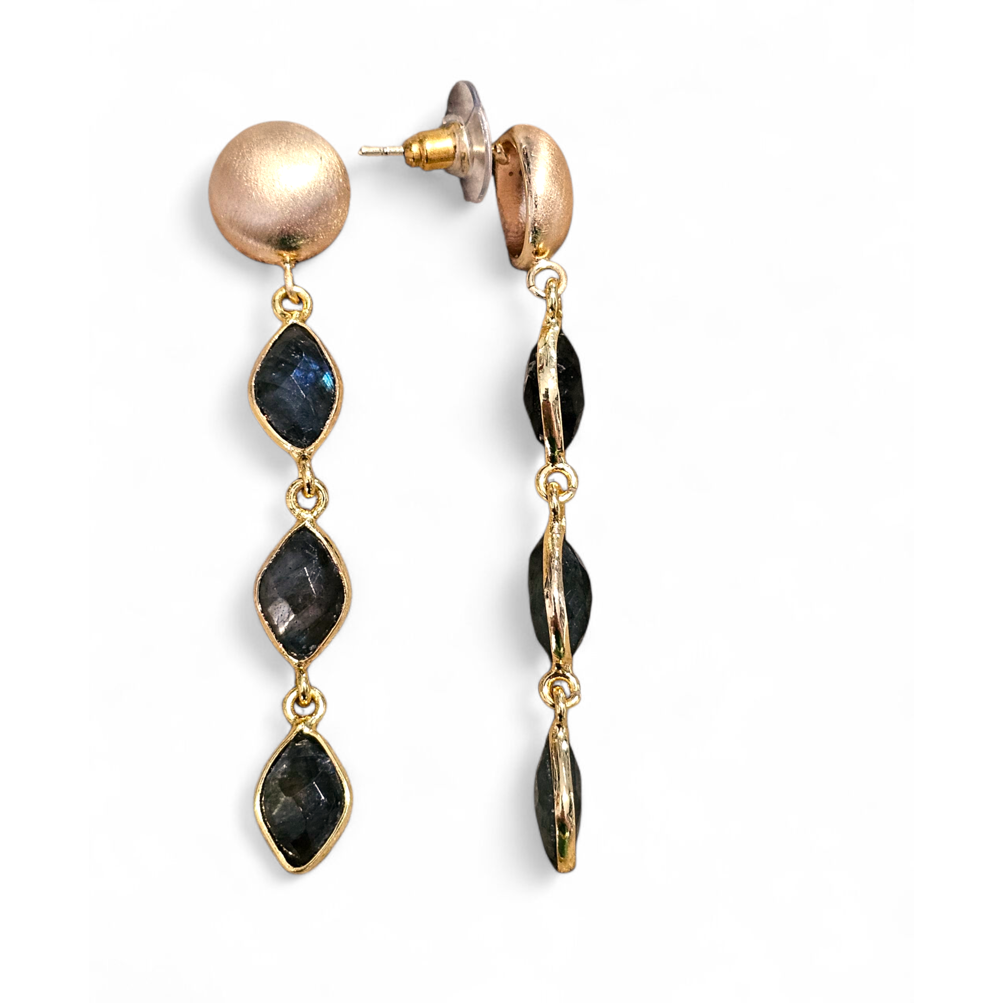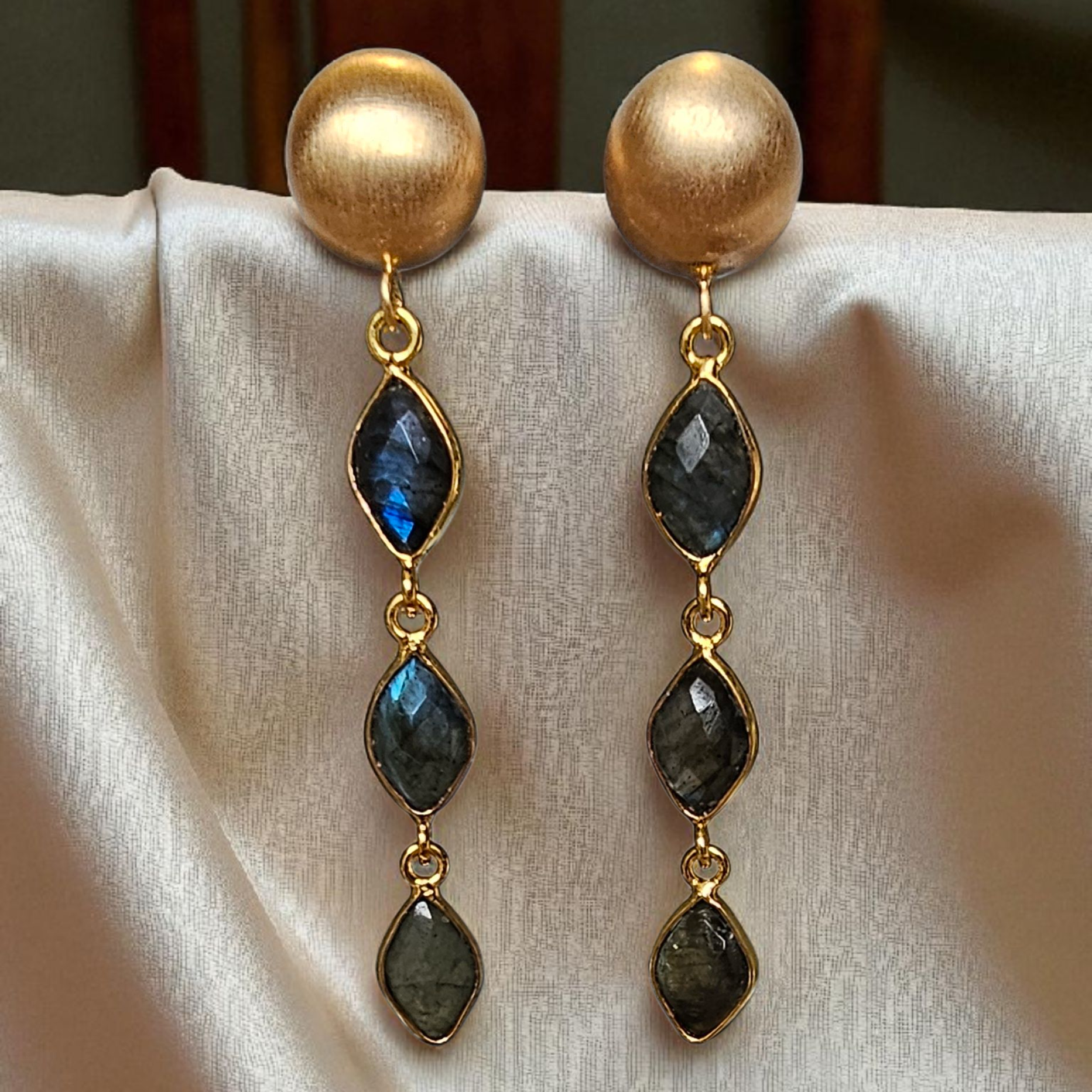 Noctara is a sleek three-stone design crafted with luminous labradorite. Each stone reveals shifting shades of blue and green as it catches the light, giving the earrings a subtle yet magnetic glow. At 6 cm in length and only 3.5 grams, they offer presence without weight a refined balance of mystery and elegance.