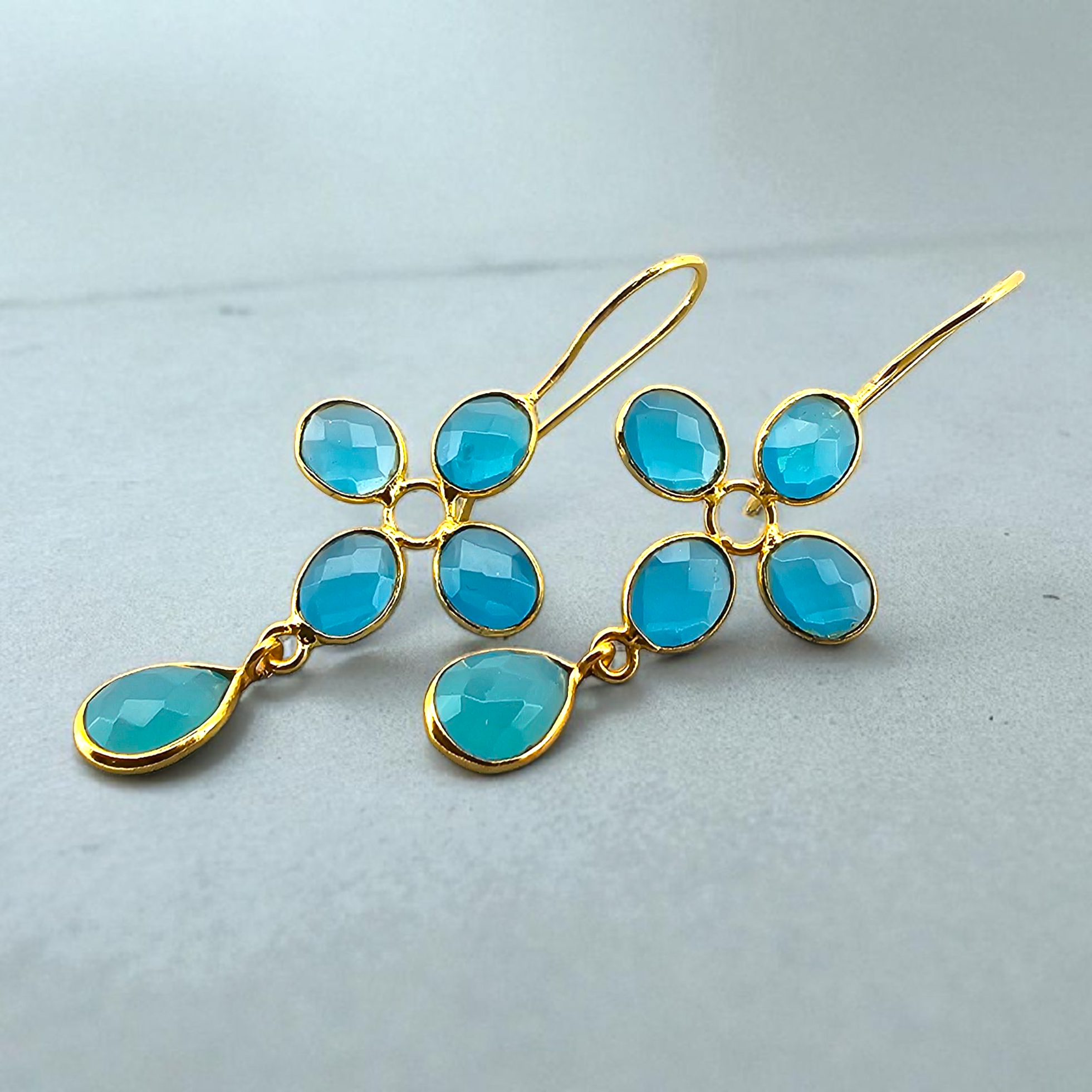 Caelora is a refined floral design crafted with five soft blue chalcedony stones. Their serene, sky-like hue radiates calm and elegance, forming delicate petals that shimmer with every movement. At 6 cm in length and featherlight at only 2 grams, Caelora is as airy as it is graceful a piece that elevates both everyday and evening looks.