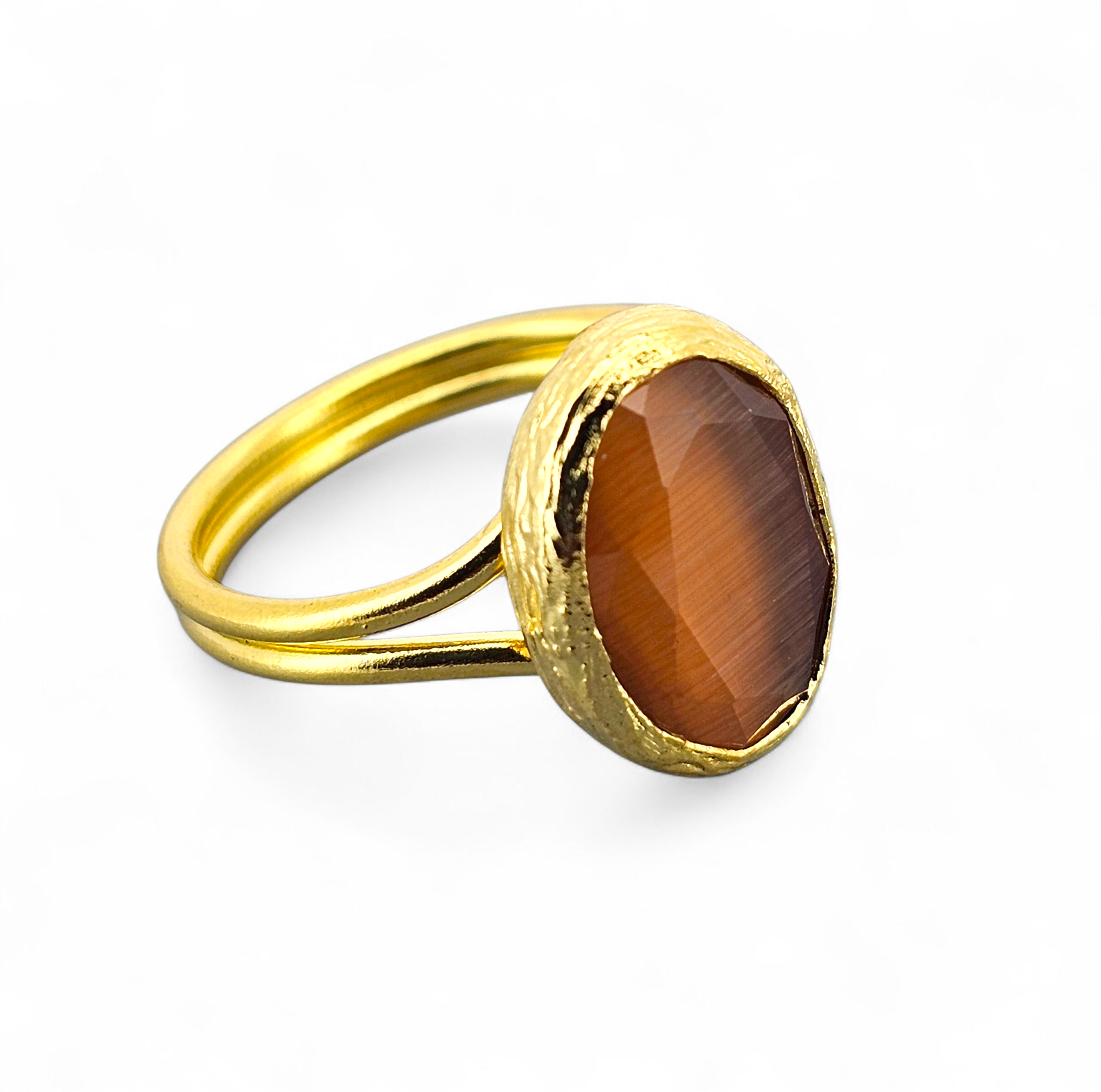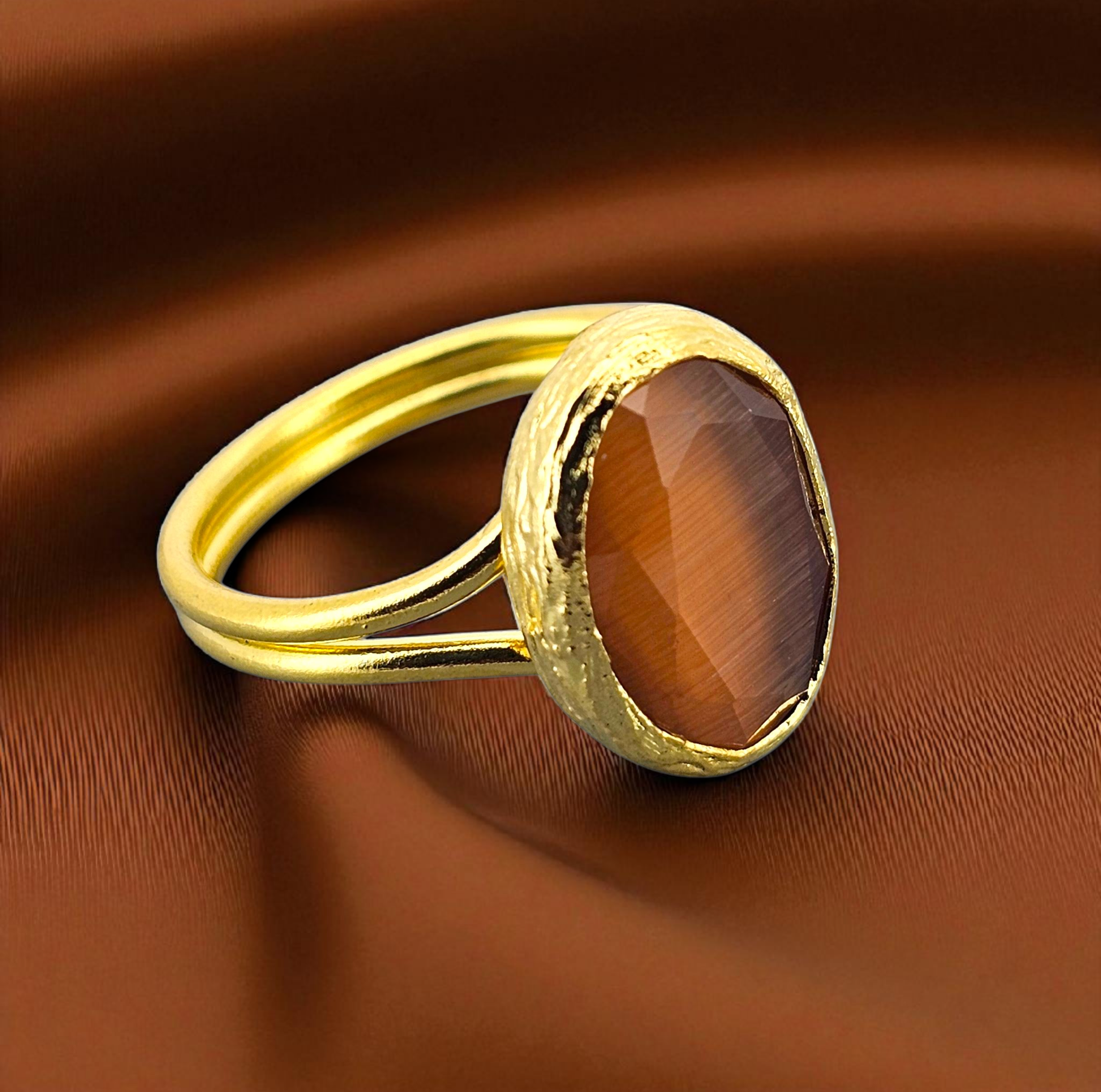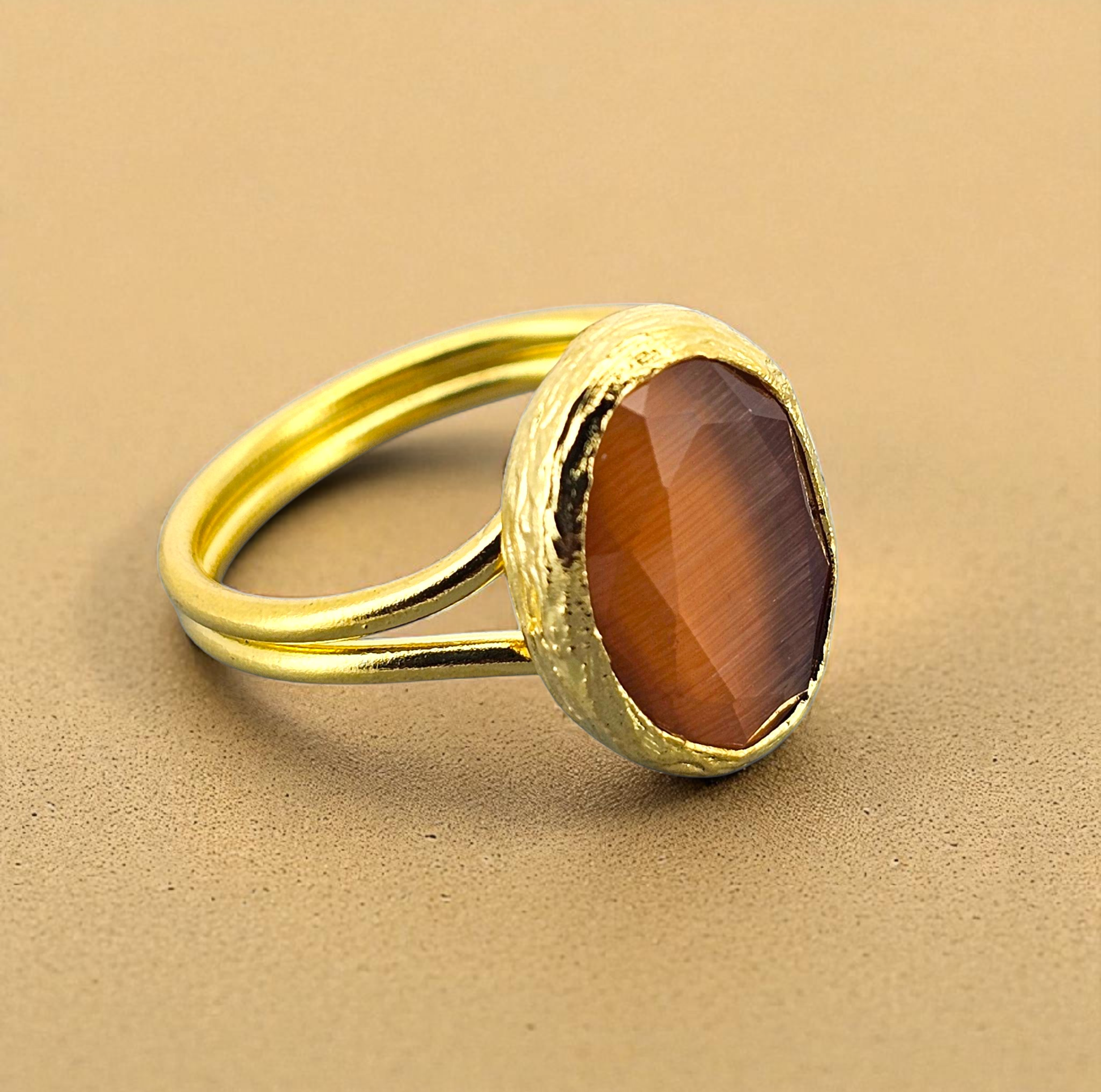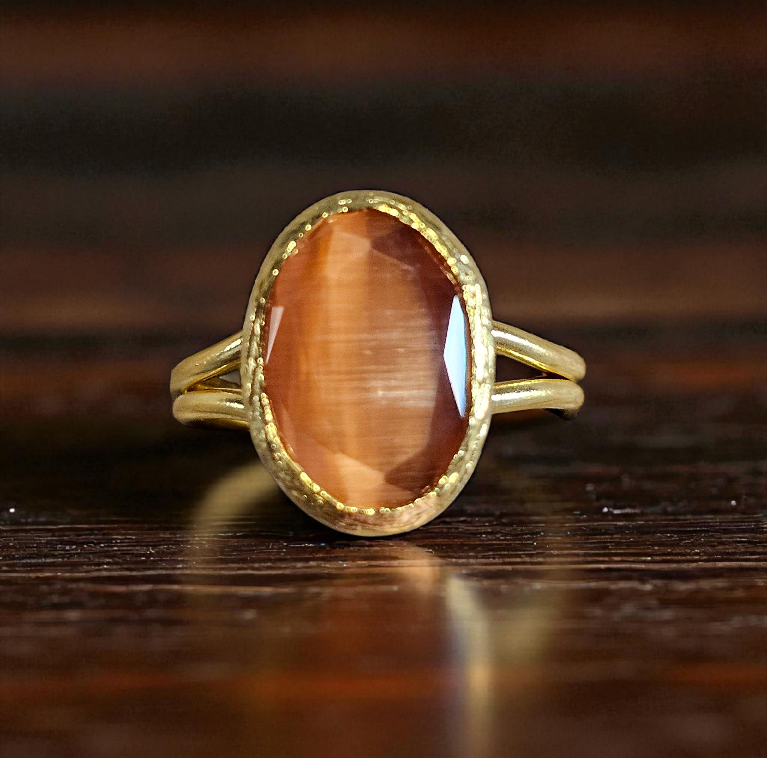 Glow Ring Orange is set with a smooth oval cateye stone (10 × 14 mm) that reflects the light with its characteristic shifting stripe. The vibrant orange tone adds a bold yet refined accent to any look. With an adjustable band (size 16–18) and a lightweight 3 g design, it’s comfortable enough for everyday wear while still making a statement.