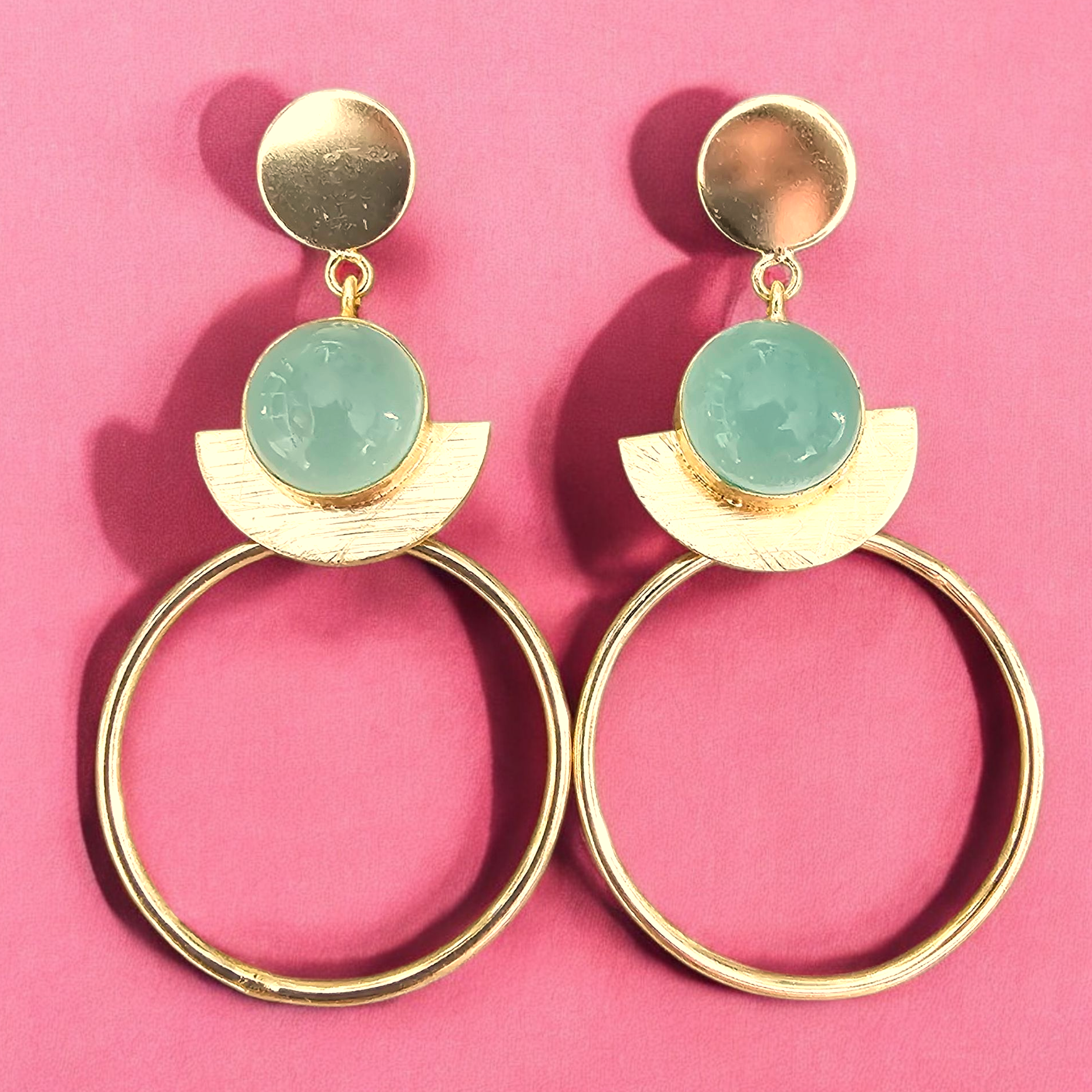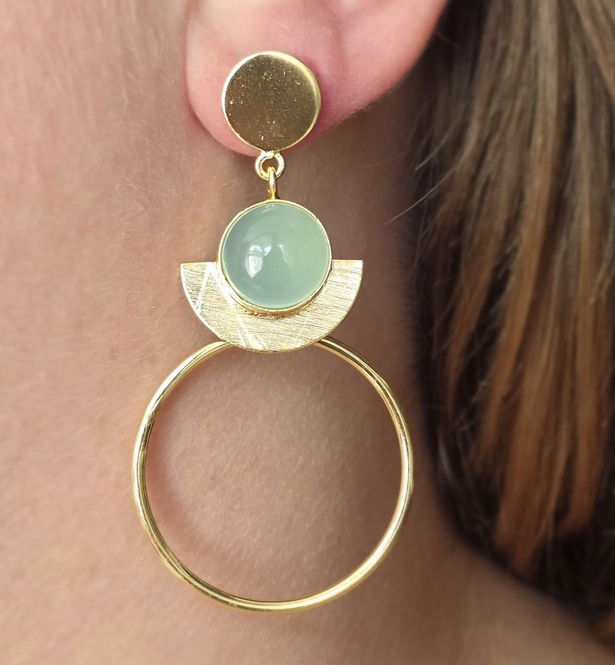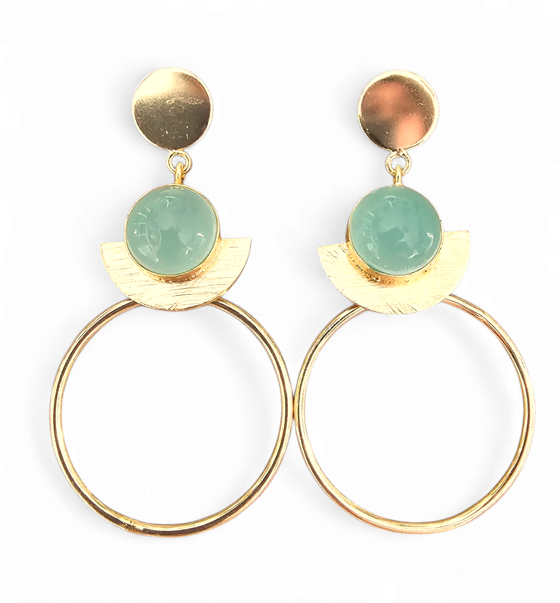 Each earring is carefully crafted by hand cut, formed, and assembled with precision. Made from 24k gold-plated brass, the design carries intention in every line. The aqua calci stone adds clarity and stillness, like a drop of water held in orbit.