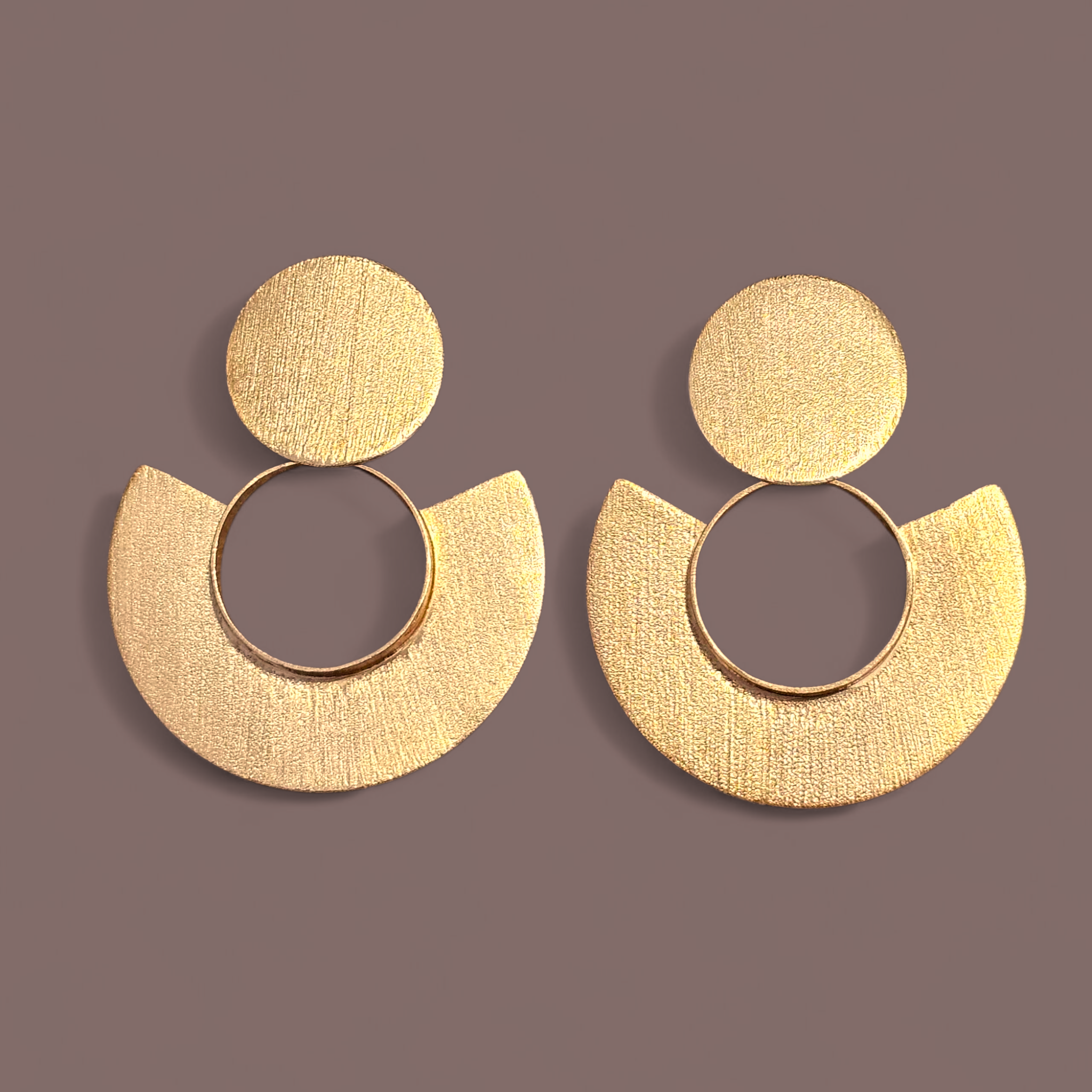 Aurea is air with weight. A golden circle anchors the ear, while a hand-sawn fan shape unfolds beneath sharp, minimal, and in perfect proportion. The design is a quiet gesture of movement and strength, crafted from raw brass with rhythm and care.
