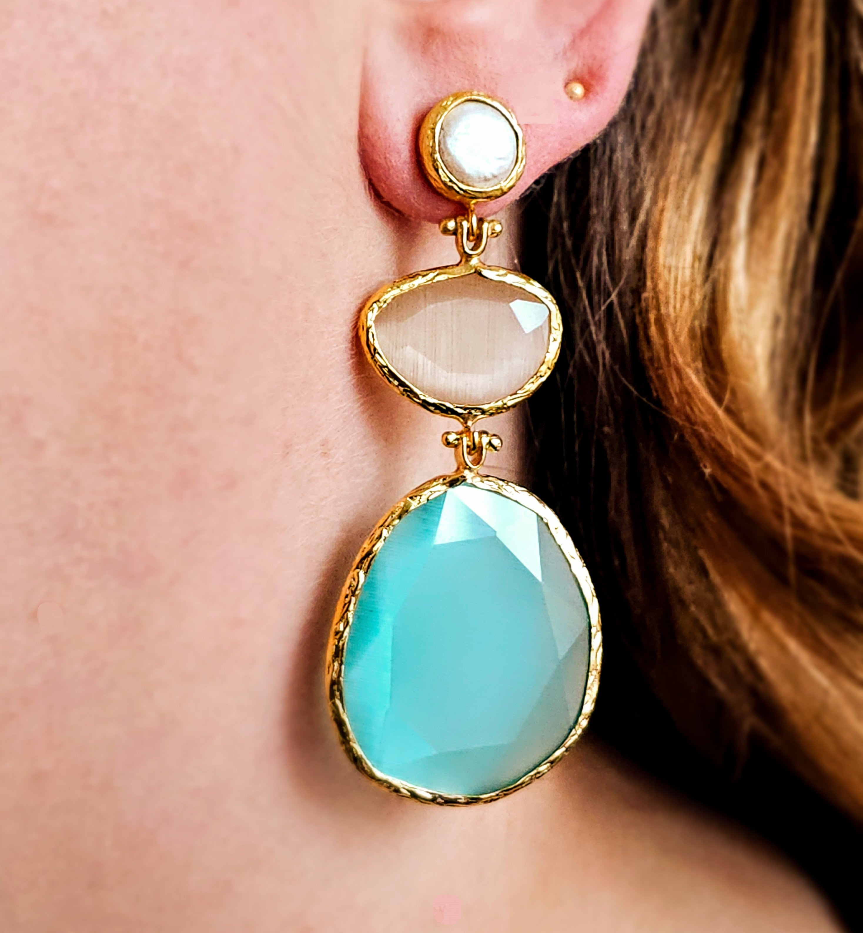 Material: "Made with cateye stones, a freshwater pearl, and 24k gold-plated brass. "