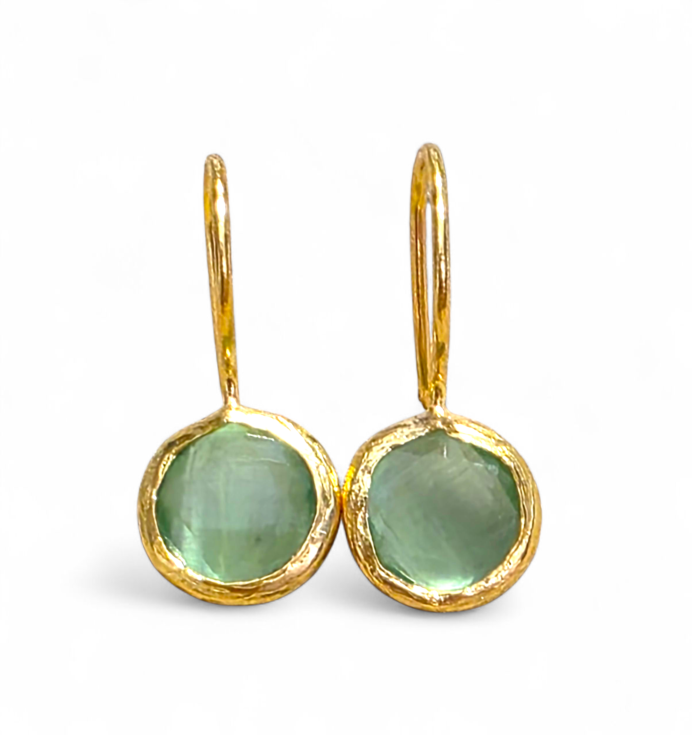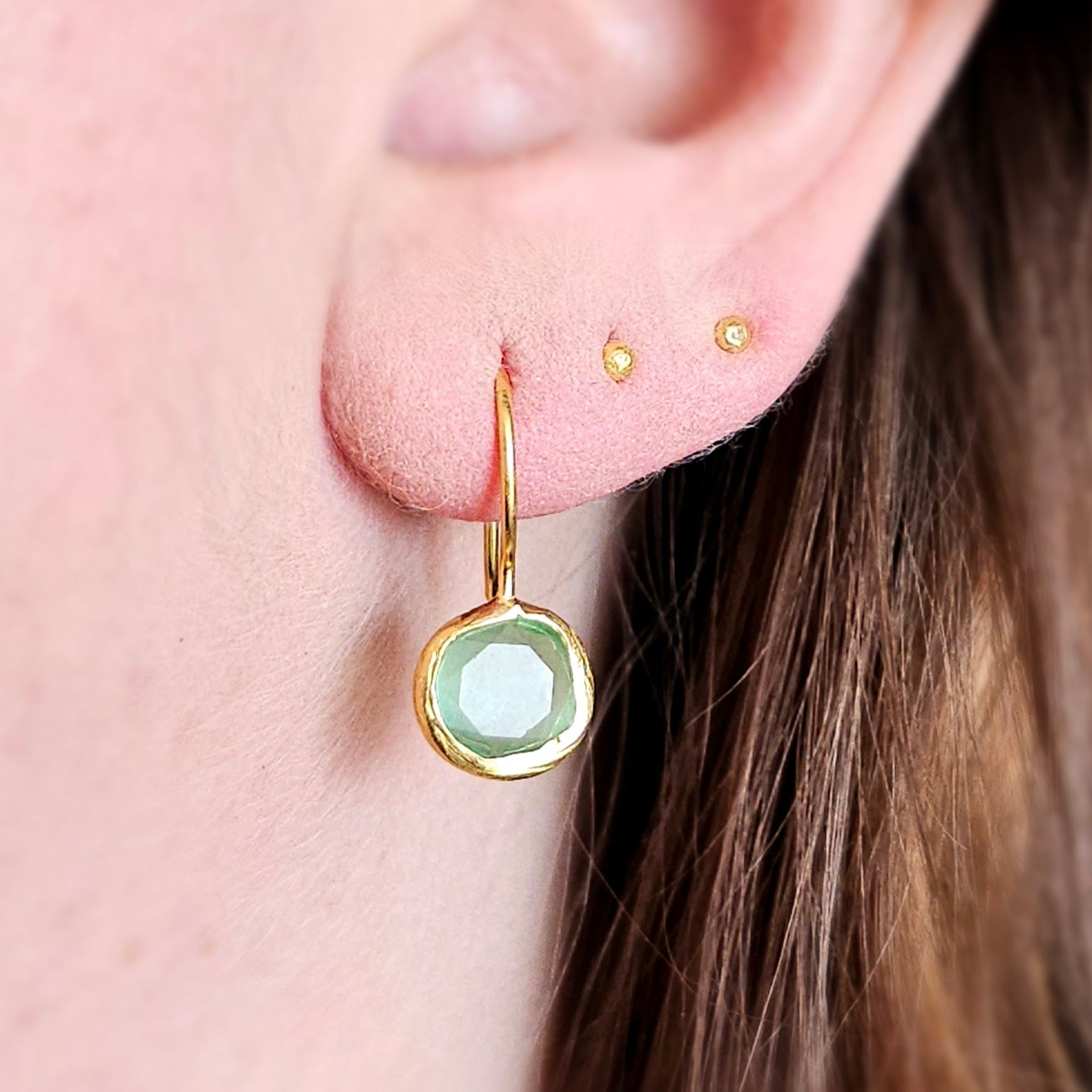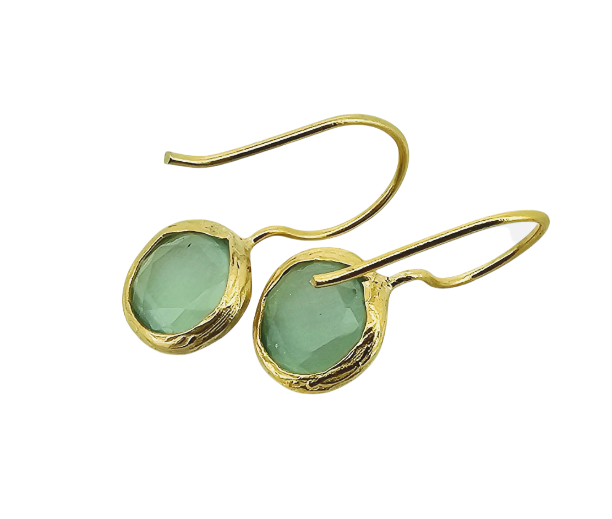 Each piece is cast in brass, plated with 24k gold, and hand-finished to reveal the light-filled glow of the green stone. The silhouette is clean and effortless a drop of awakening, worn with ease.