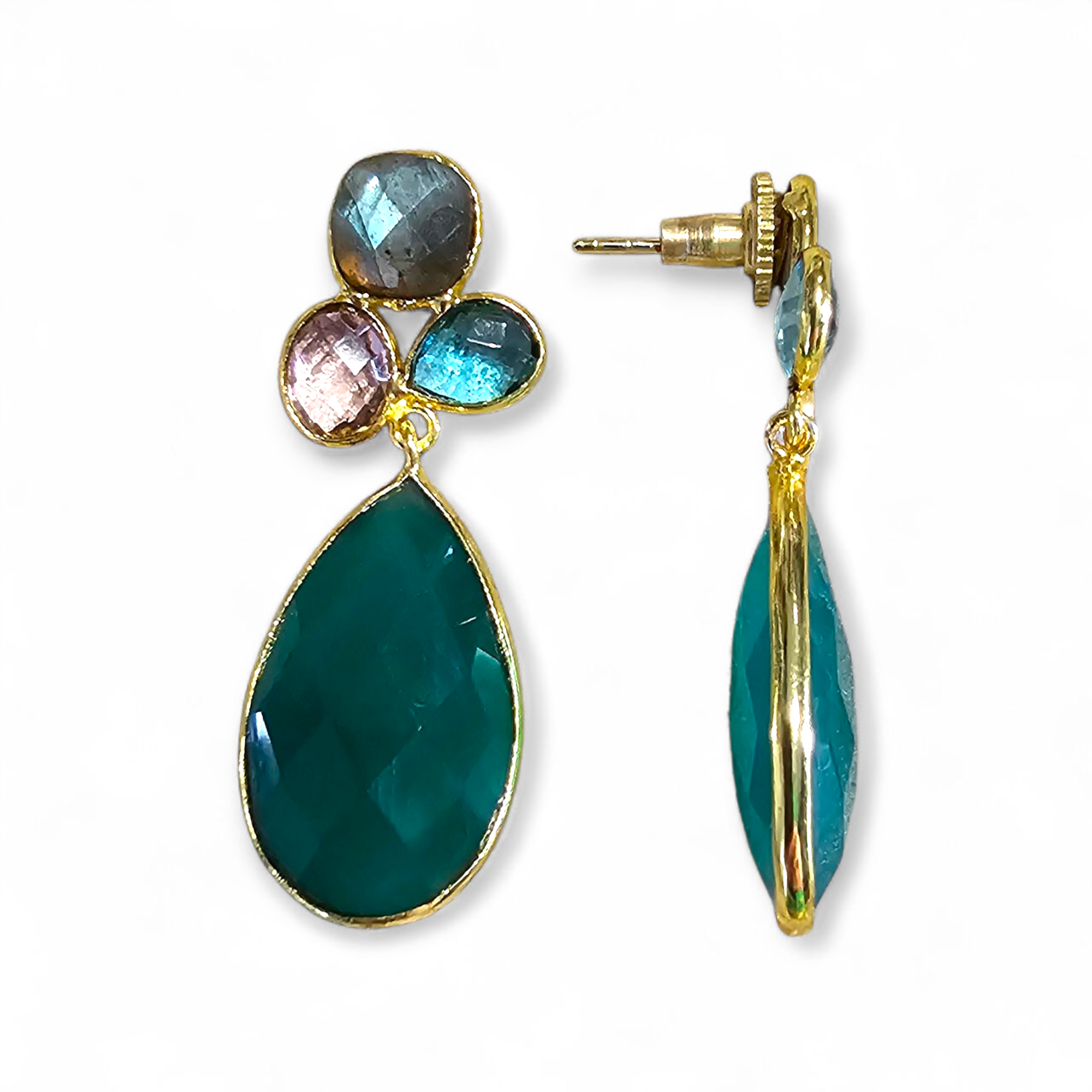 Isvara is a refined three-stone drop design that blends the shifting glow of labradorite with the crystal clarity of hydro quartz and the deep green depth of onyx. At 4.5 cm in length and 5.7 grams in weight, it carries a subtle gravitas while remaining elegant and balanced. A piece that feels both grounded and luminous, perfect for evening refinement or daytime sophistication.