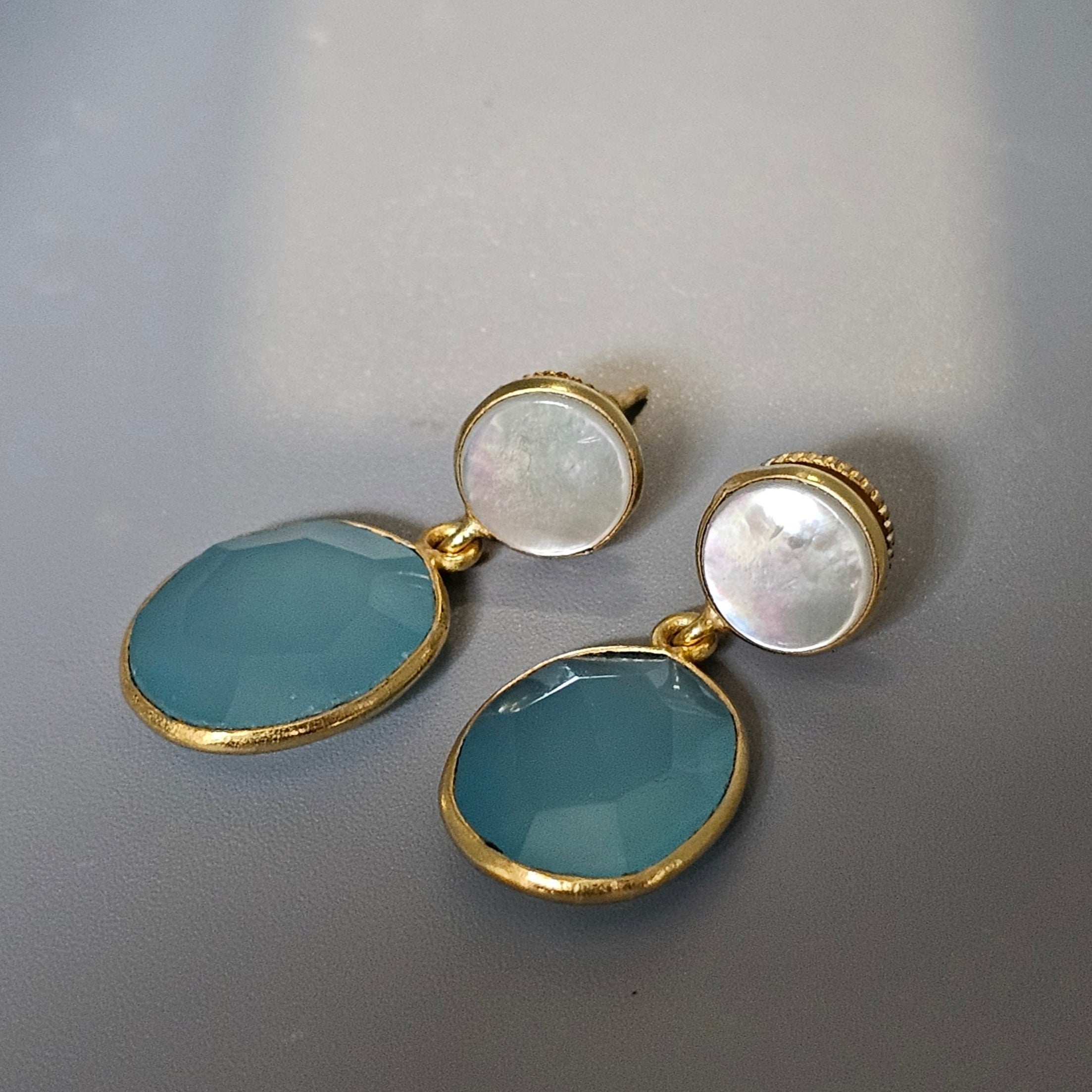 Material: "22k gold-plated brass, aqua chalcedony, mother of pearl."