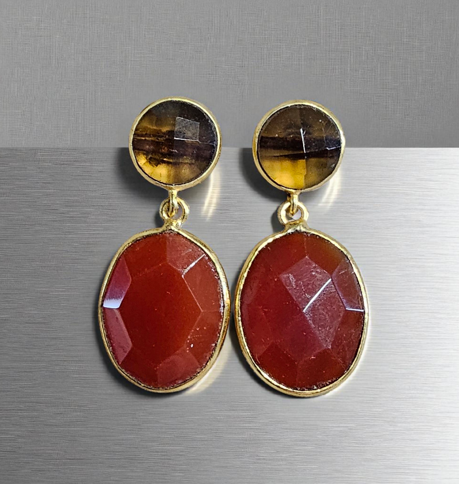 Material: "22k gold-plated brass, natural carnelian, natural smoky quartz."