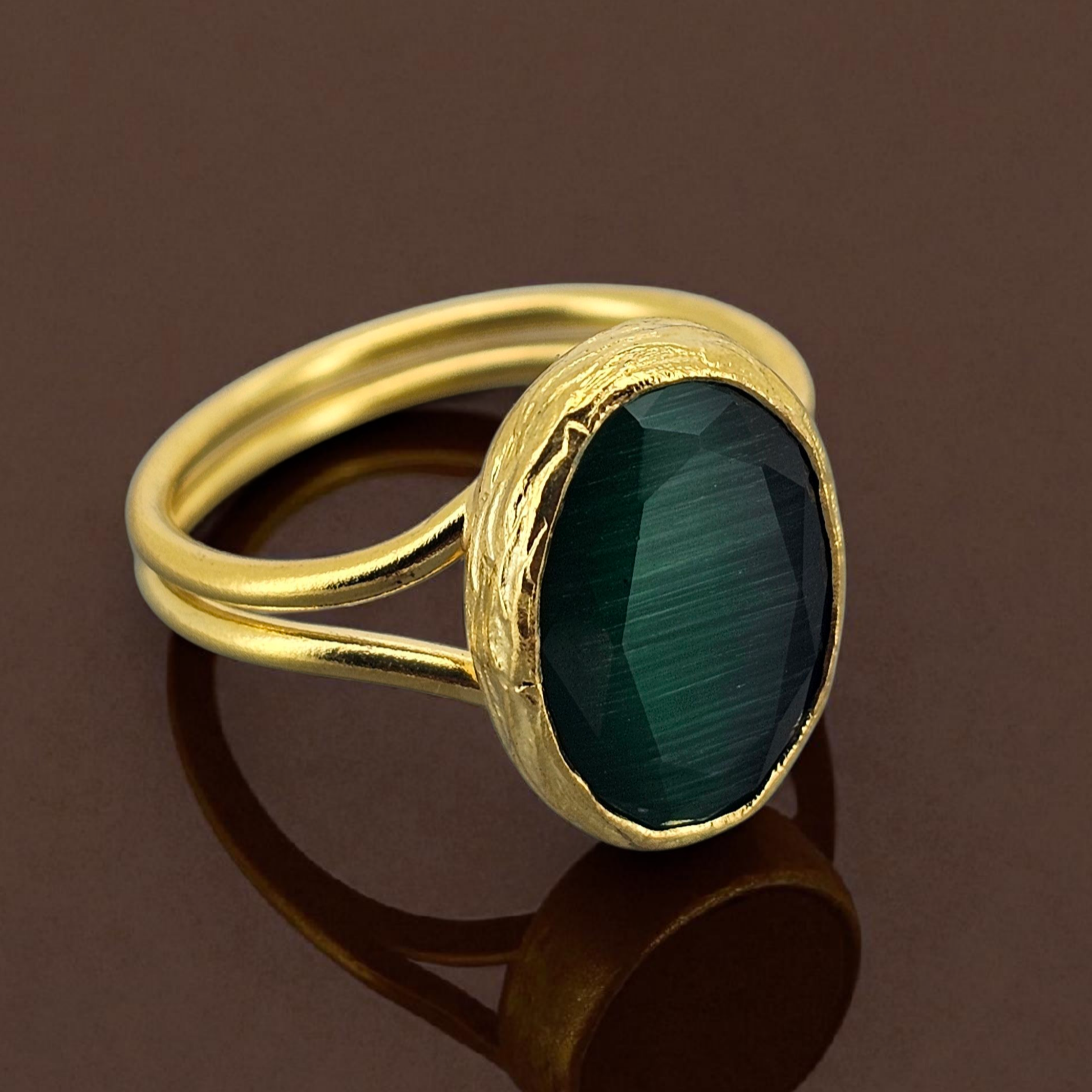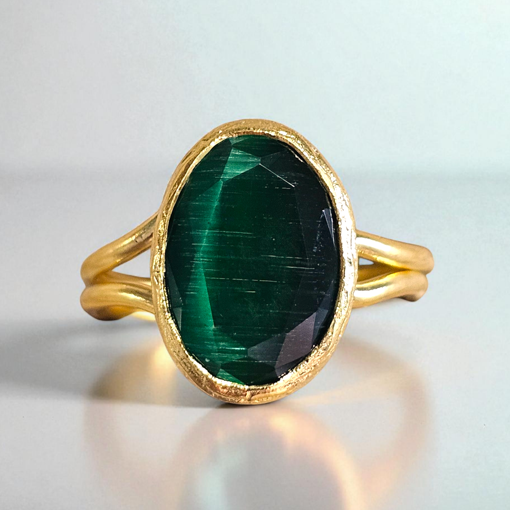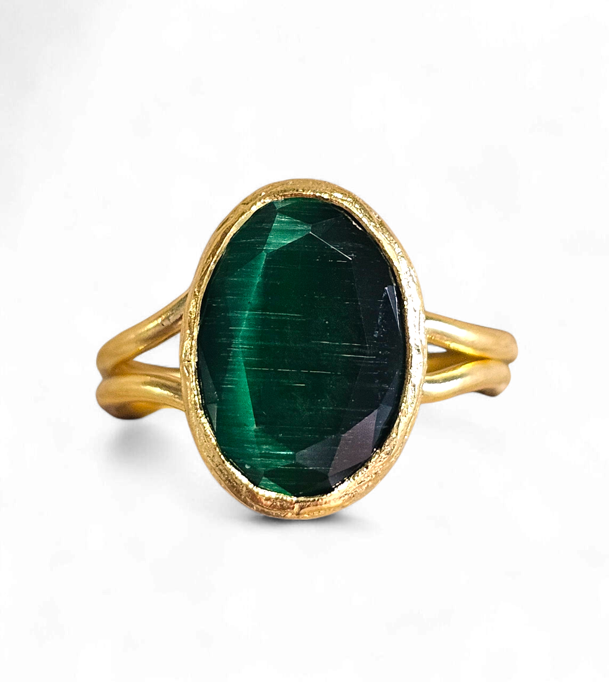 Glow Ring Emerald is set with a smooth oval cateye stone (10 × 14 mm) that reflects the light with its signature shifting stripe. The deep emerald green shade adds a bold yet timeless accent, perfect for both everyday wear and more elevated looks. With an adjustable band (size 16–18) and a lightweight 3 g design, it offers comfort without losing impact.