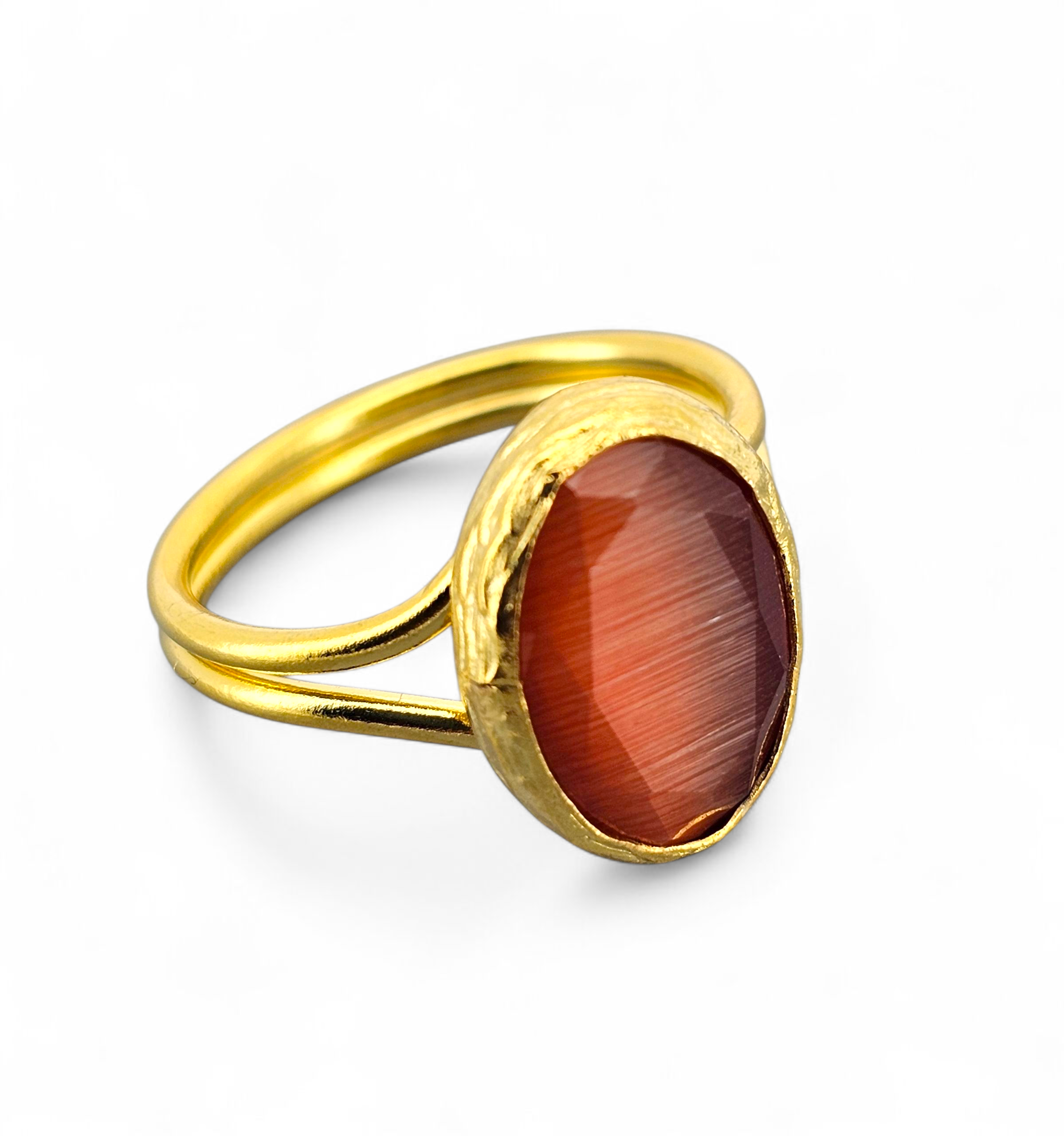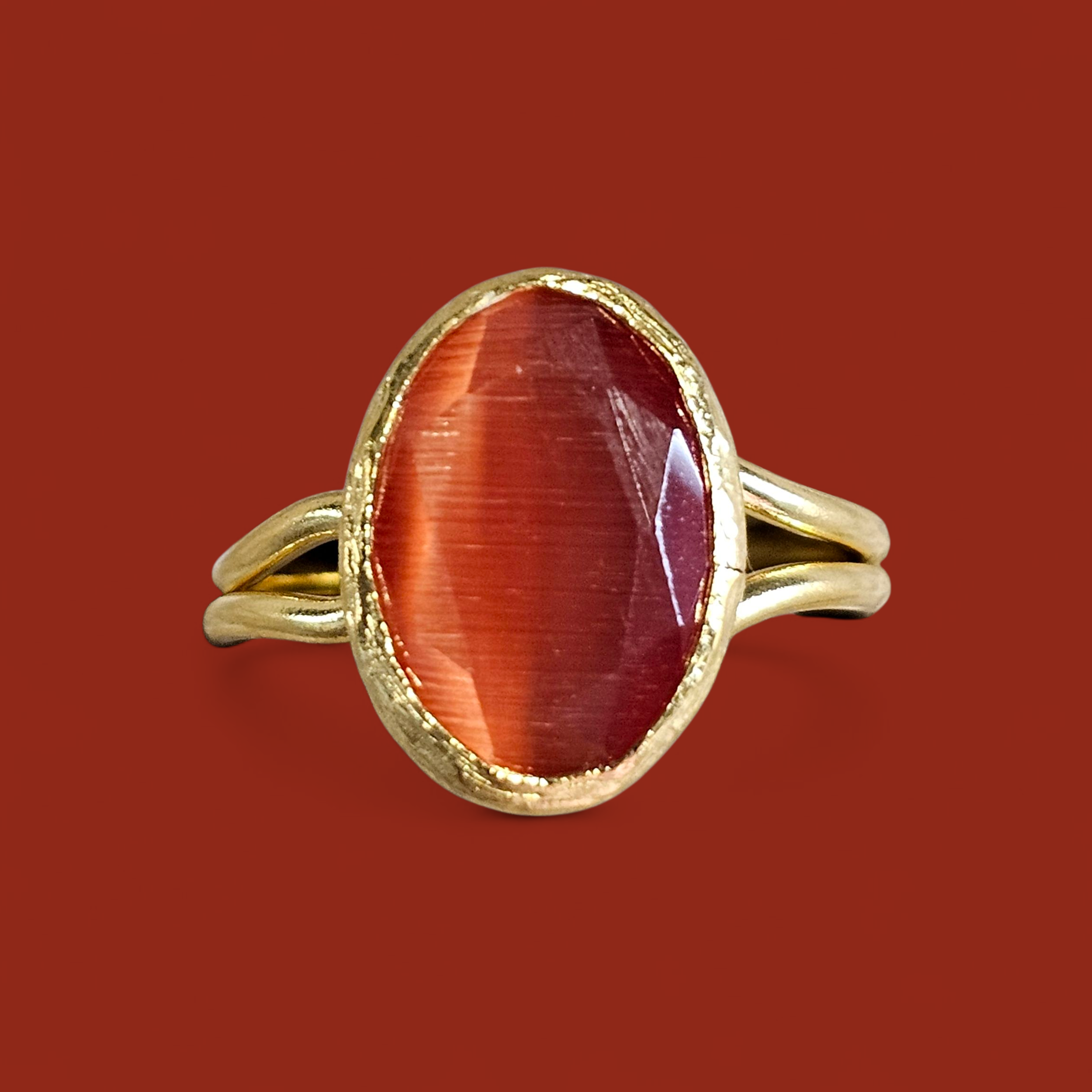 Glow Ring Red is set with a smooth oval cateye stone (10 × 14 mm) that reflects the light with its signature shifting stripe. The bold red tone adds a powerful, eye-catching accent — timeless yet playful. With an adjustable band (size 16–18) and a lightweight 3 g design, it’s easy to wear every day while making a striking statement.