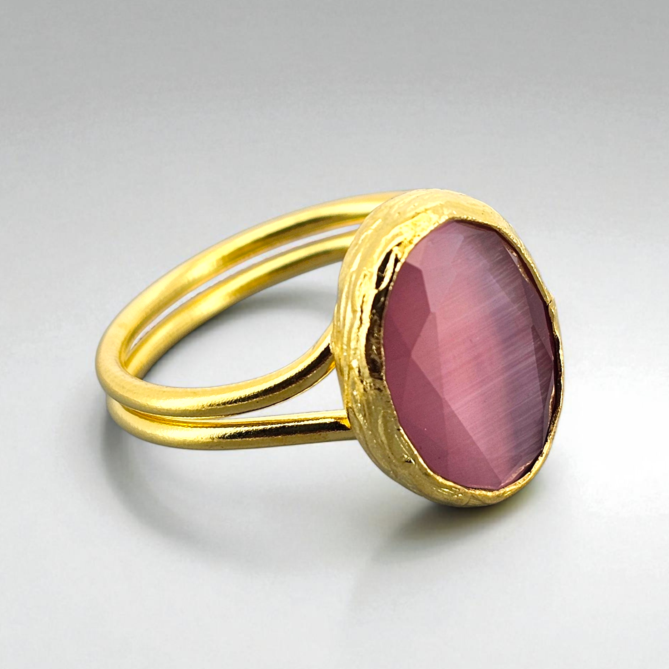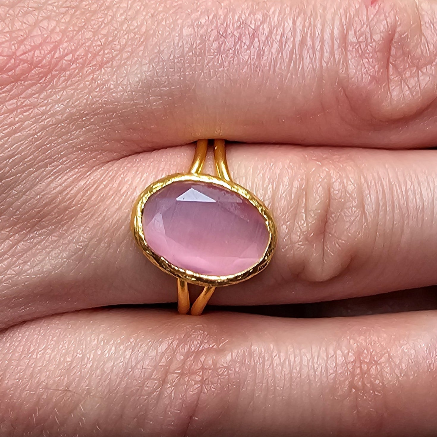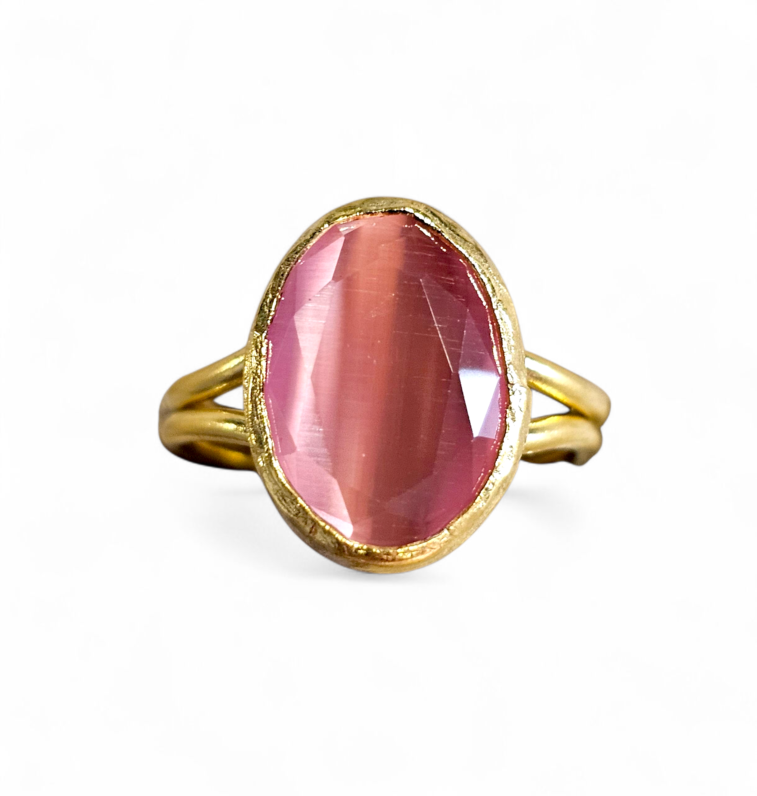 Glow Ring Pink is set with a smooth oval cateye stone (10 × 14 mm) that reflects the light with its signature shifting stripe. The soft pink shade adds a delicate yet playful accent, making it a versatile piece for both everyday wear and special occasions. With an adjustable band (size 16–18) and a lightweight 3 g design, it combines comfort with subtle elegance.