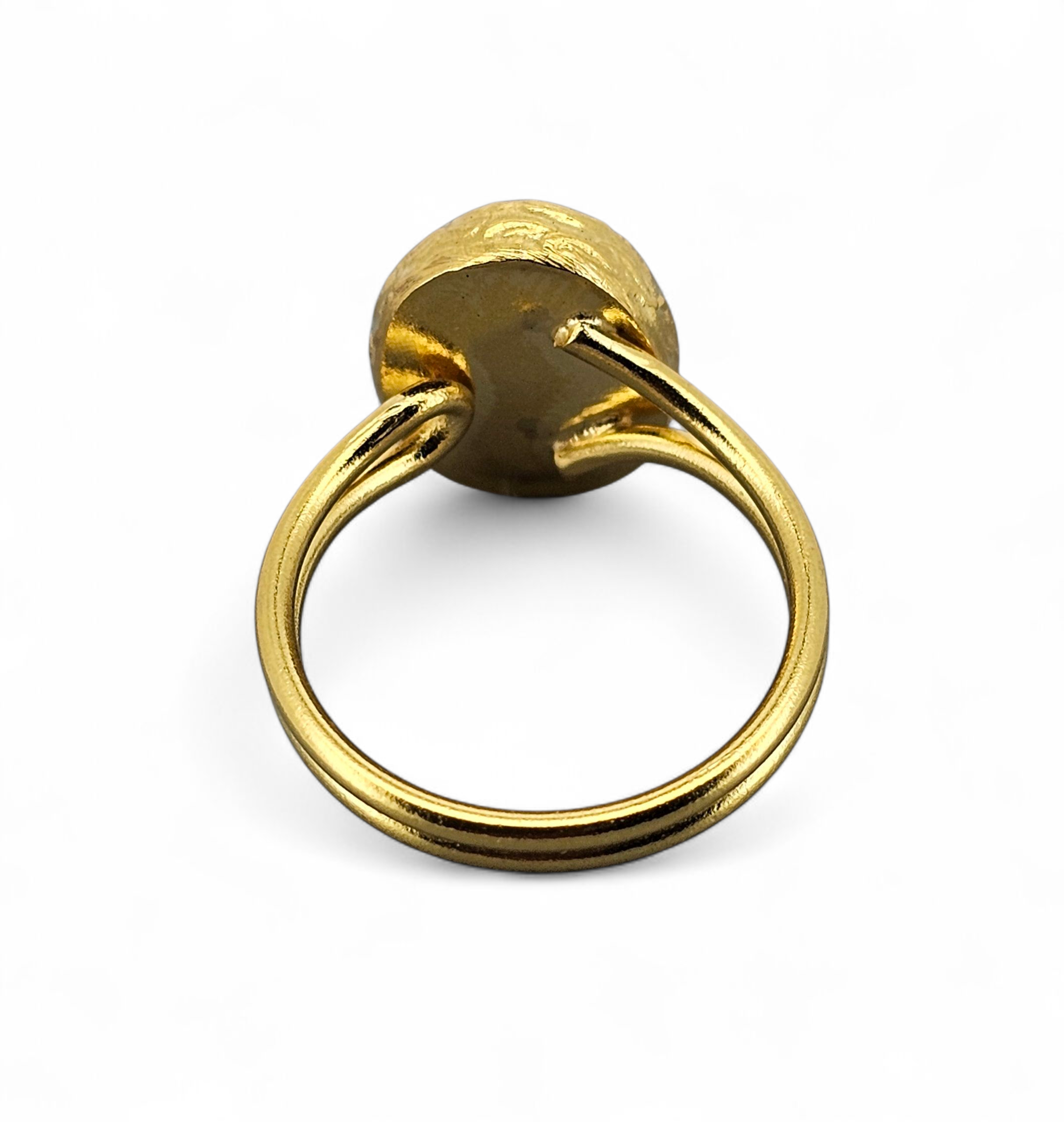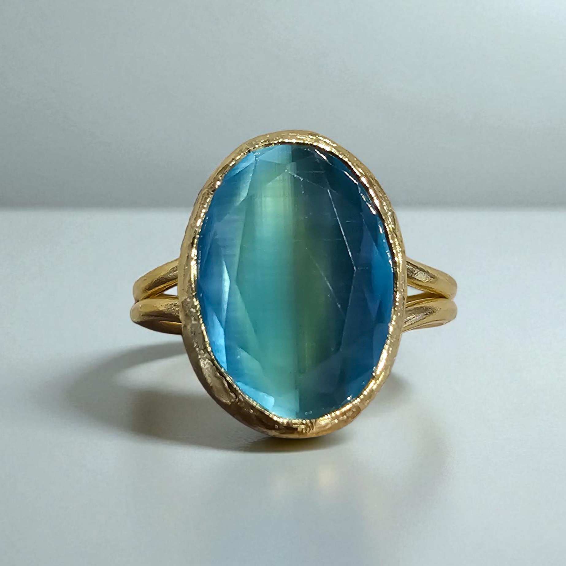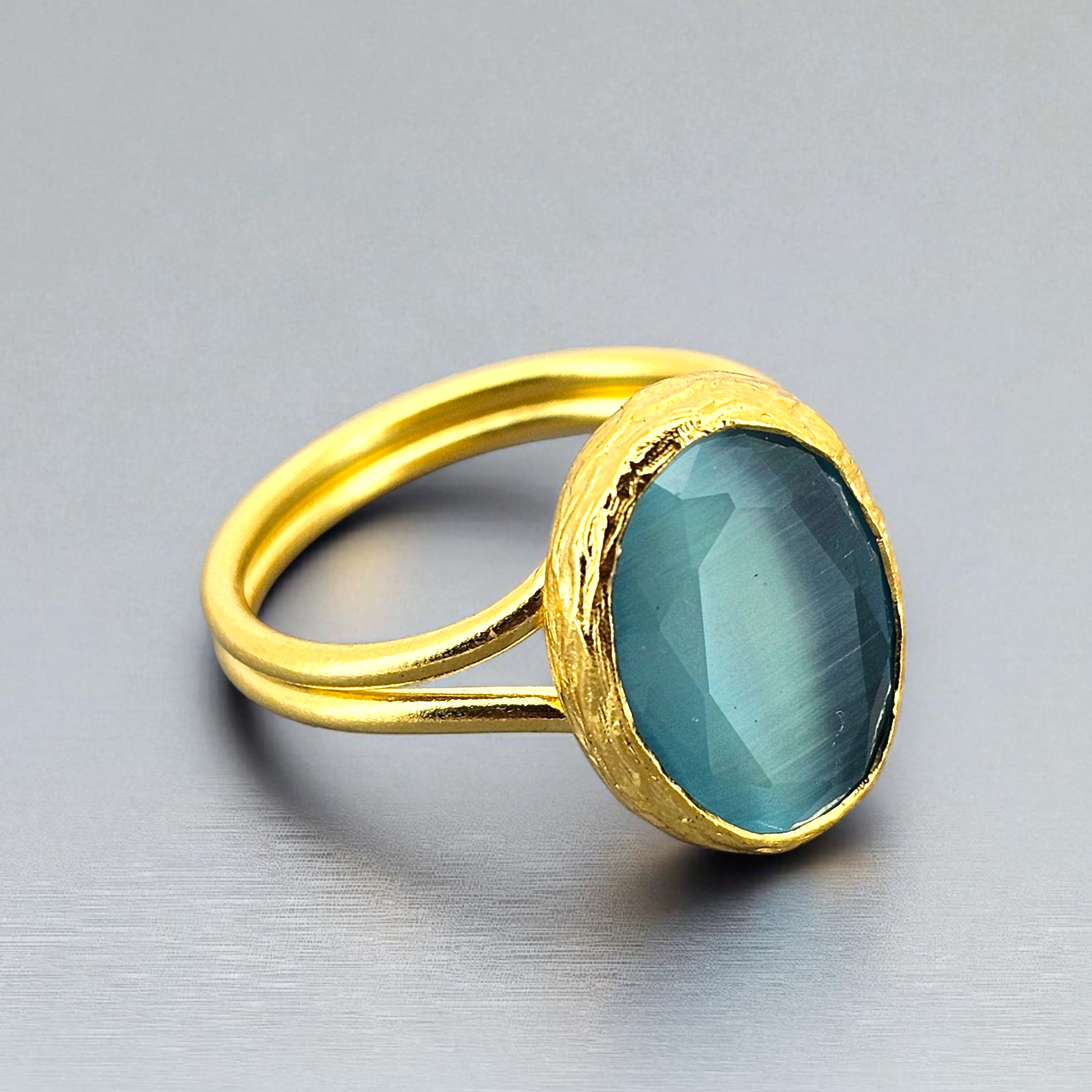 Glow Ring Seagreen is set with a smooth oval cateye stone (10 × 14 mm) that reflects the light with its characteristic shifting stripe. The fresh seagreen tone brings a vibrant yet calming accent, making it a versatile piece for both everyday wear and special occasions. With an adjustable band (size 16–18) and a lightweight 3 g design, it combines comfort with effortless style.
